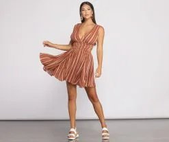 Get ready to create a chic impression with a mini dress that keeps it casual and stylish! The dress features a sleeveless V-neckline with a twist-front accent, spaghetti straps, a cutout at the midriff, ruching throughout, and a mini-length silhouette. The dress is composed of a smooth knit fabric that offers a form hugging fit with a moderate stretch. Complete look with