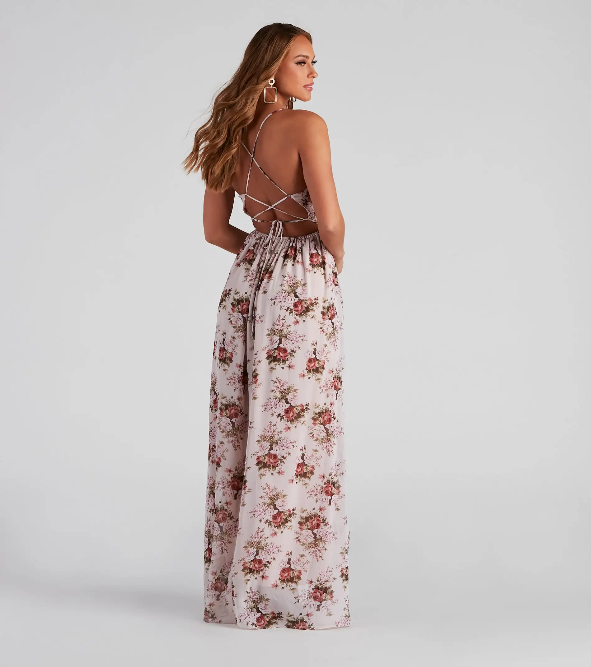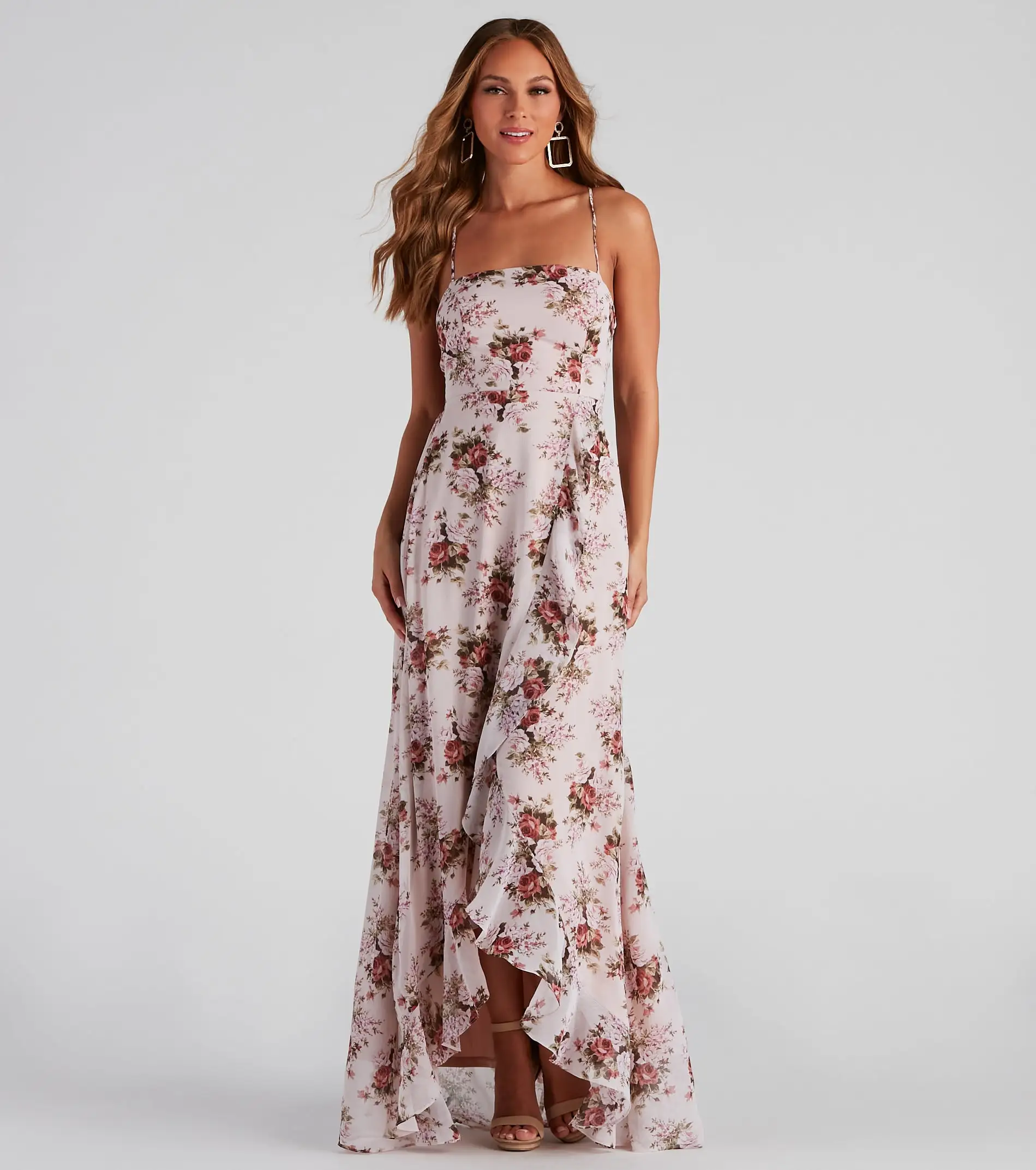 Lace up in a formal dress that brings the romance! Rue features a pretty floral pattern, a sleeveless square neckline with padded cups, spaghetti straps that lead to a cross-back, and a lace-up back. Her slim fit bodice leads to a flowy wrap silhouette with a high side slit that is accented with a ruffled trim. The dress is composed of a lined of a lightweight woven fabric that offers a relaxed fit with minimal stretch. Complete look with