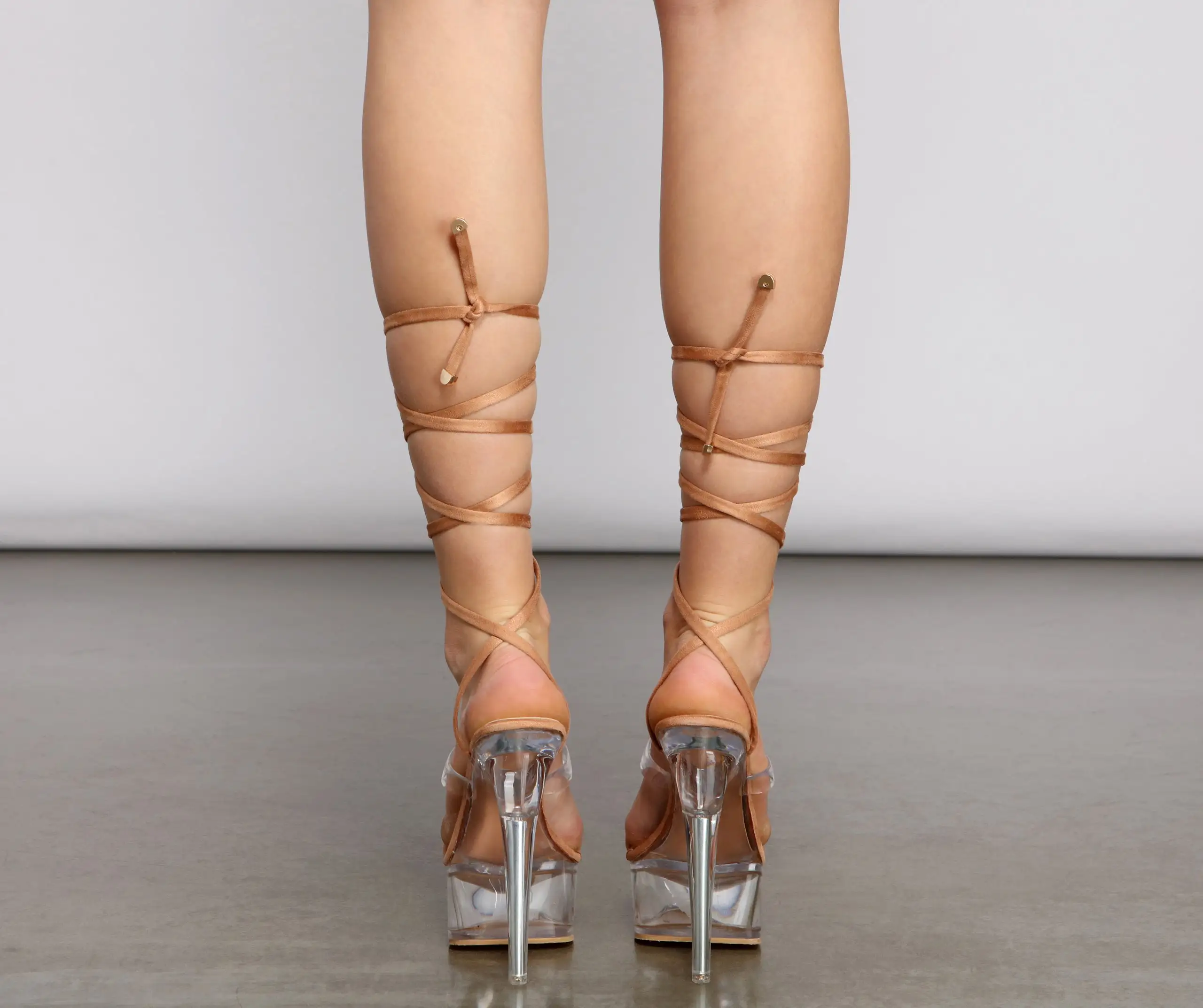 Showcase the fashion diva you are and steal the scene in these glam stiletto heels! They feature an open toe, a thin toe strap, a clear strap, a lace-up design, a dramatic lucite platform, and a tall lucite stiletto heel. Complete the look with