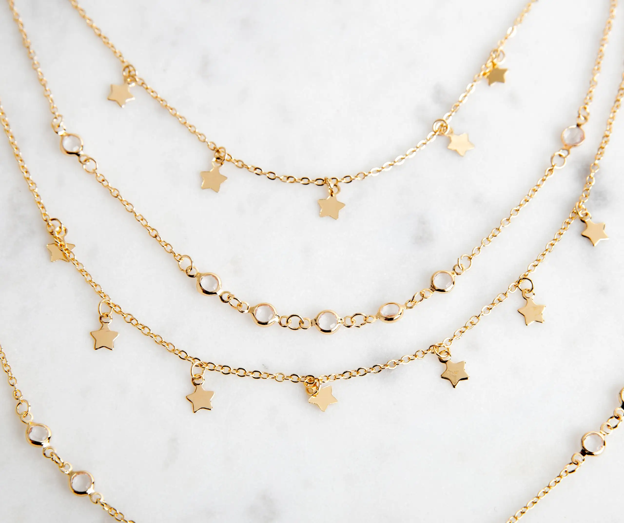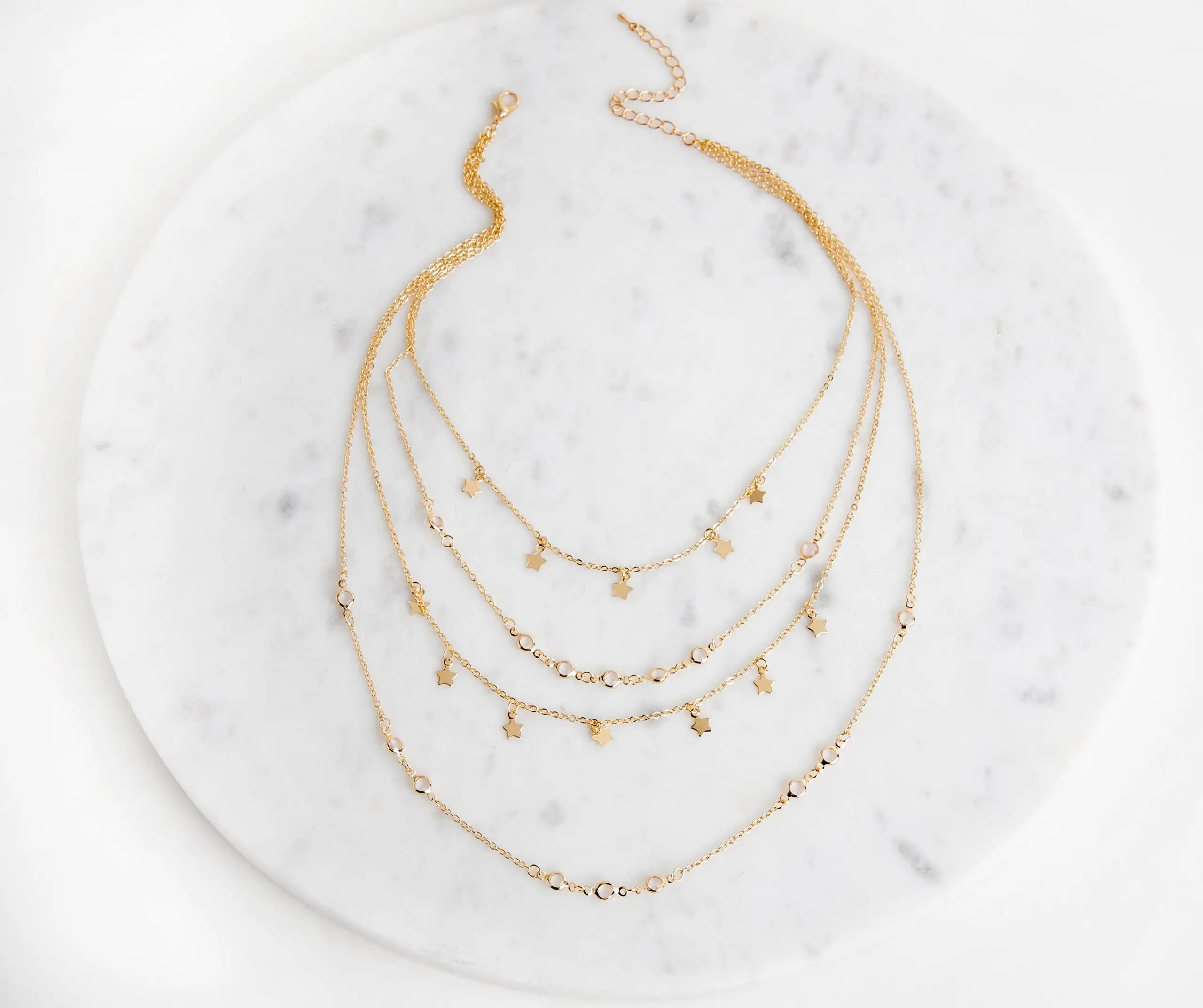 Shine like the star you are with this glowing necklace! The necklace features a dainty four row chain adored with mini flat metal star charms and clear beaded accents. Includes a lobster clasp closure.