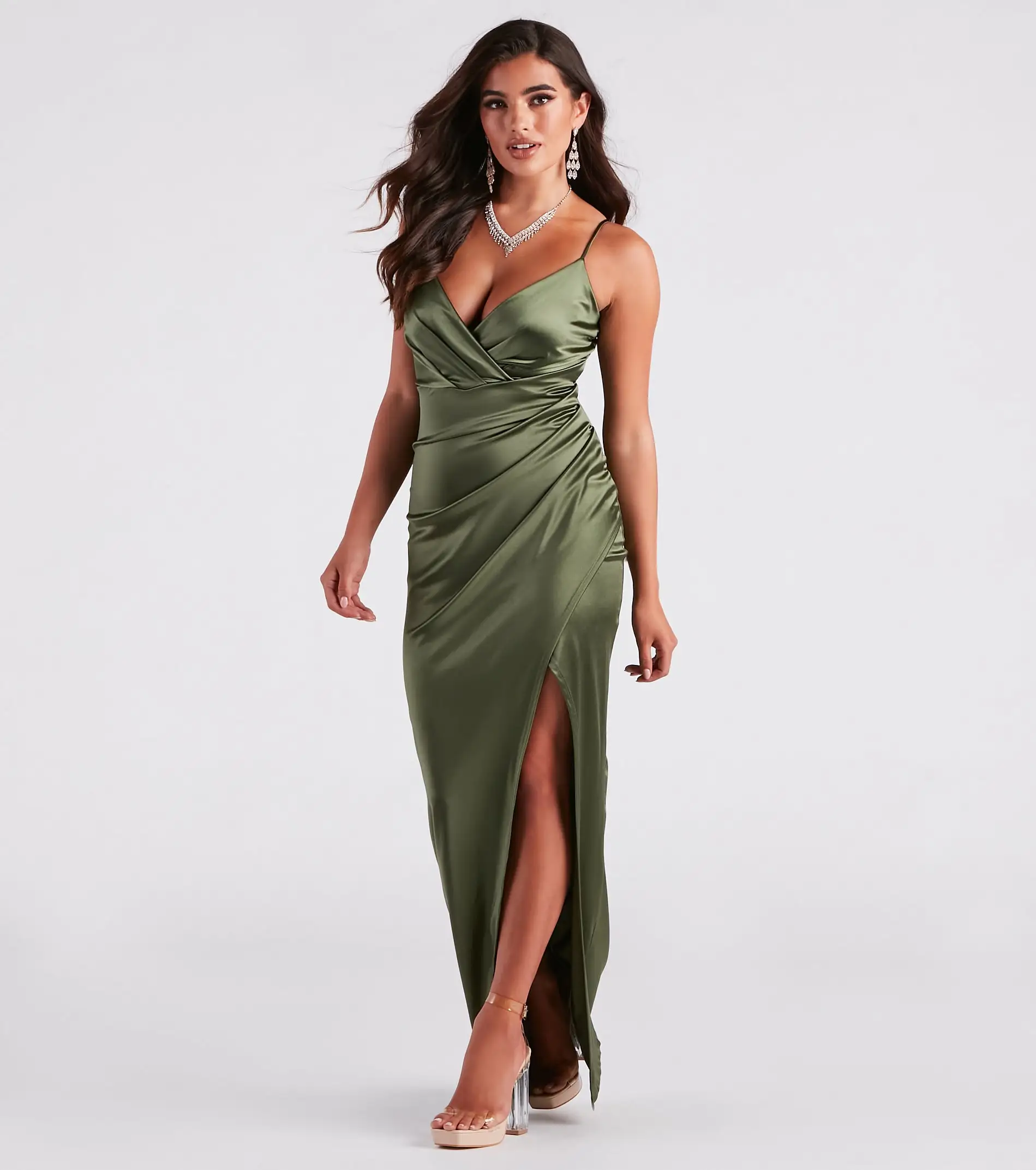 Sleek with chic sophistication, the Serena satin formal dress will bring the wow factor to your next fancy affair! She features a sleeveless V-neckline with a pleated wrap-front design, spaghetti straps, a high waist seam with stylish pleating, a floor-length hem with a wrap-front skirt creating a high side slit, and a figure-flattering, slim-fit silhouette. The silky-smooth satin-knit fabric gives off the most gorgeous sheen. Complete your look with a