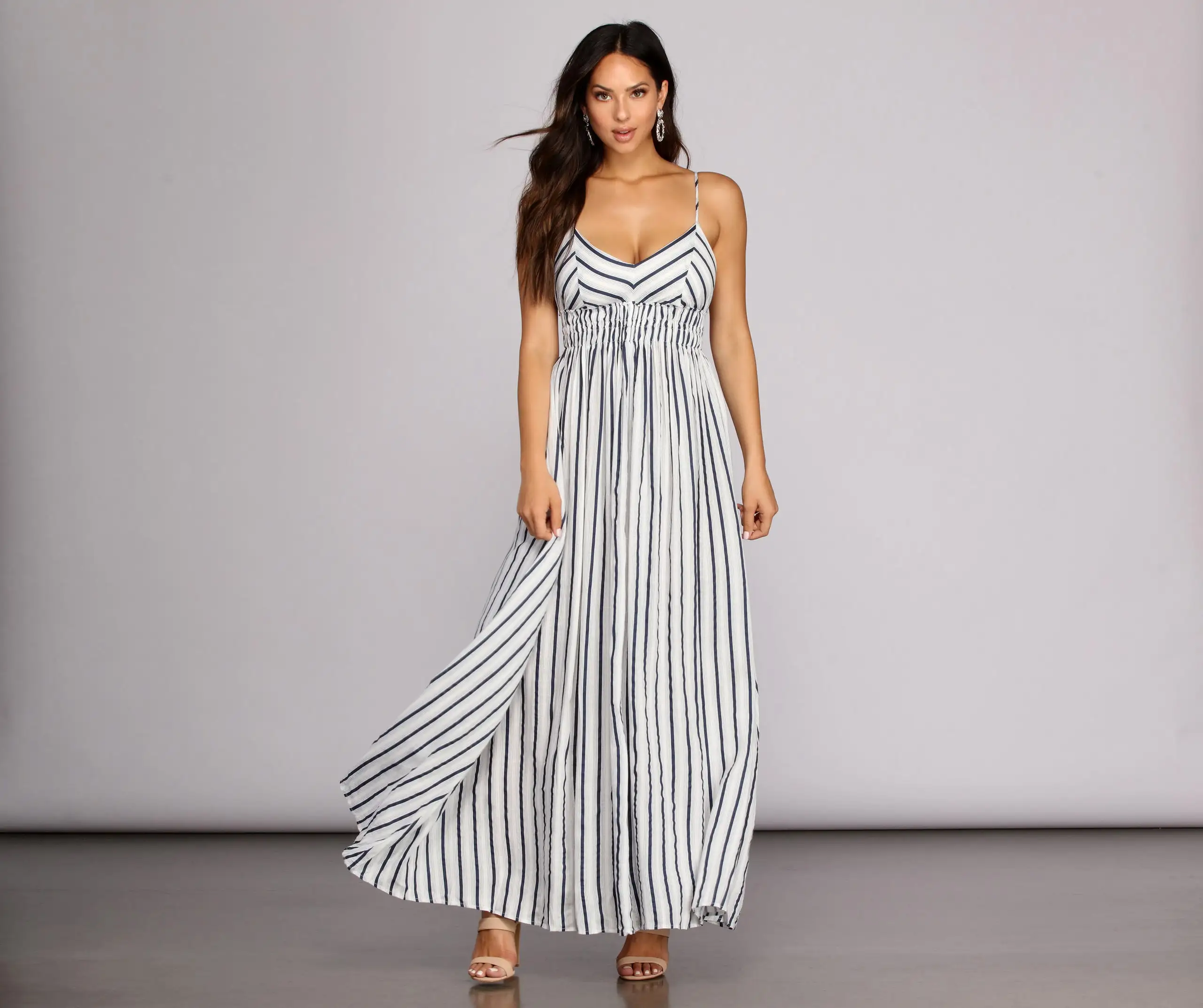 It’s full speed ahead in this summer-ready, striped maxi! Dress features adjustable spaghetti straps atop a seamed, empire-style V neck bodice with shirred waist and a full, A-line skirt. Dress is lined at bust, slips on, and is made from a linen-like woven material with little to no stretch.
