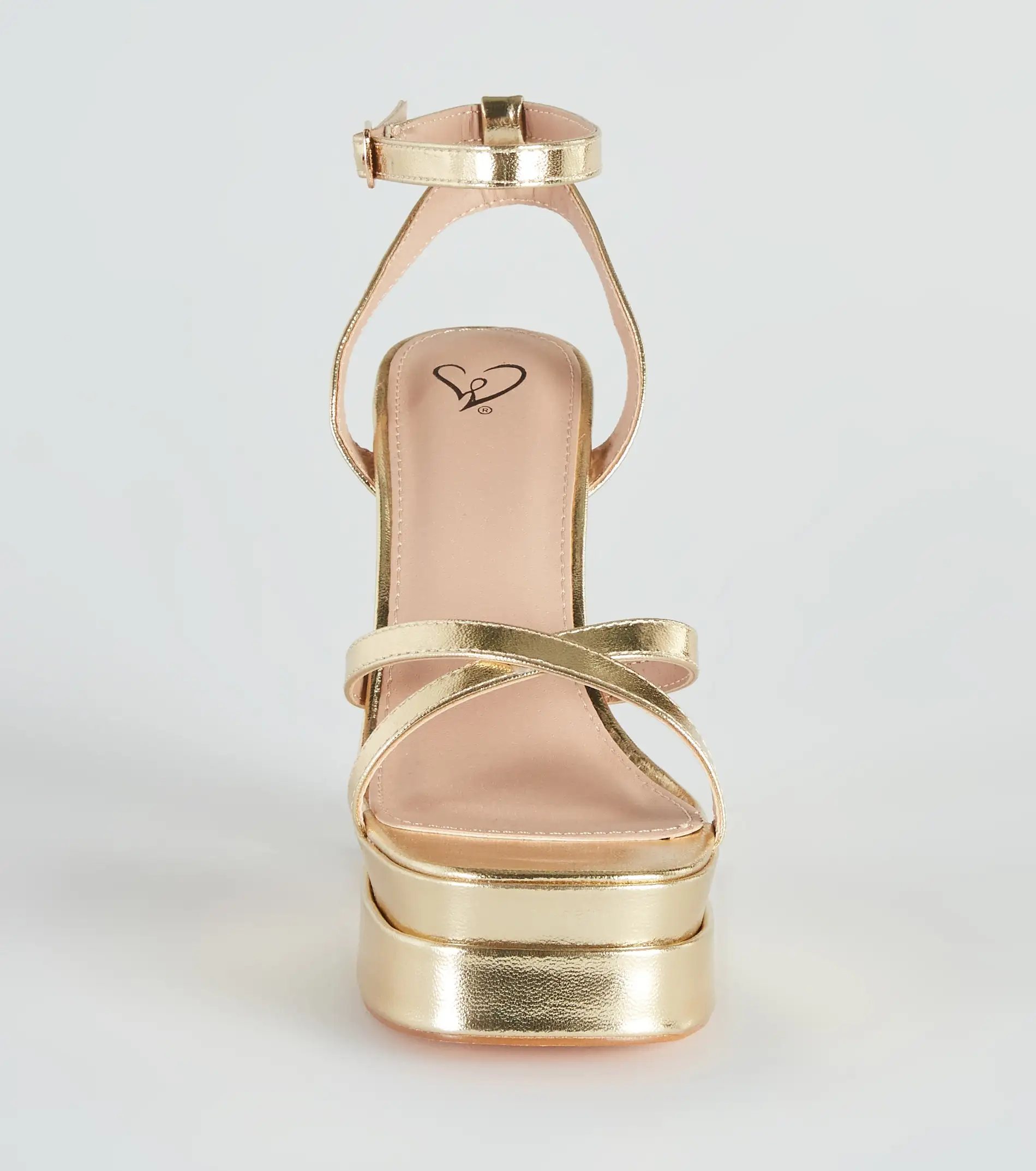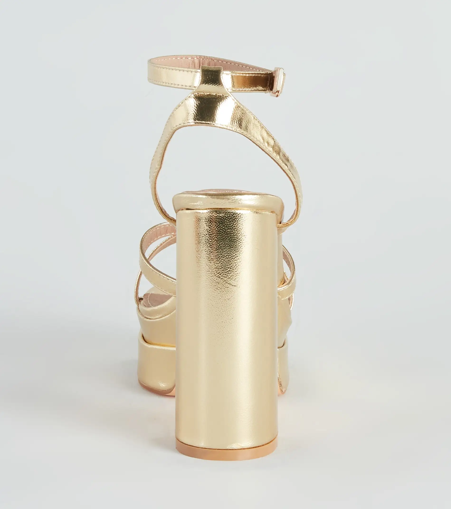 Set out to stun everywhere you walk in these metallic platform heels perfect for a formal dance or banquet! They feature a square toe, criss-cross straps, a chunky platform sole and block heel, and a supportive ankle strap with adjustable buckle closure. Complete the look with a