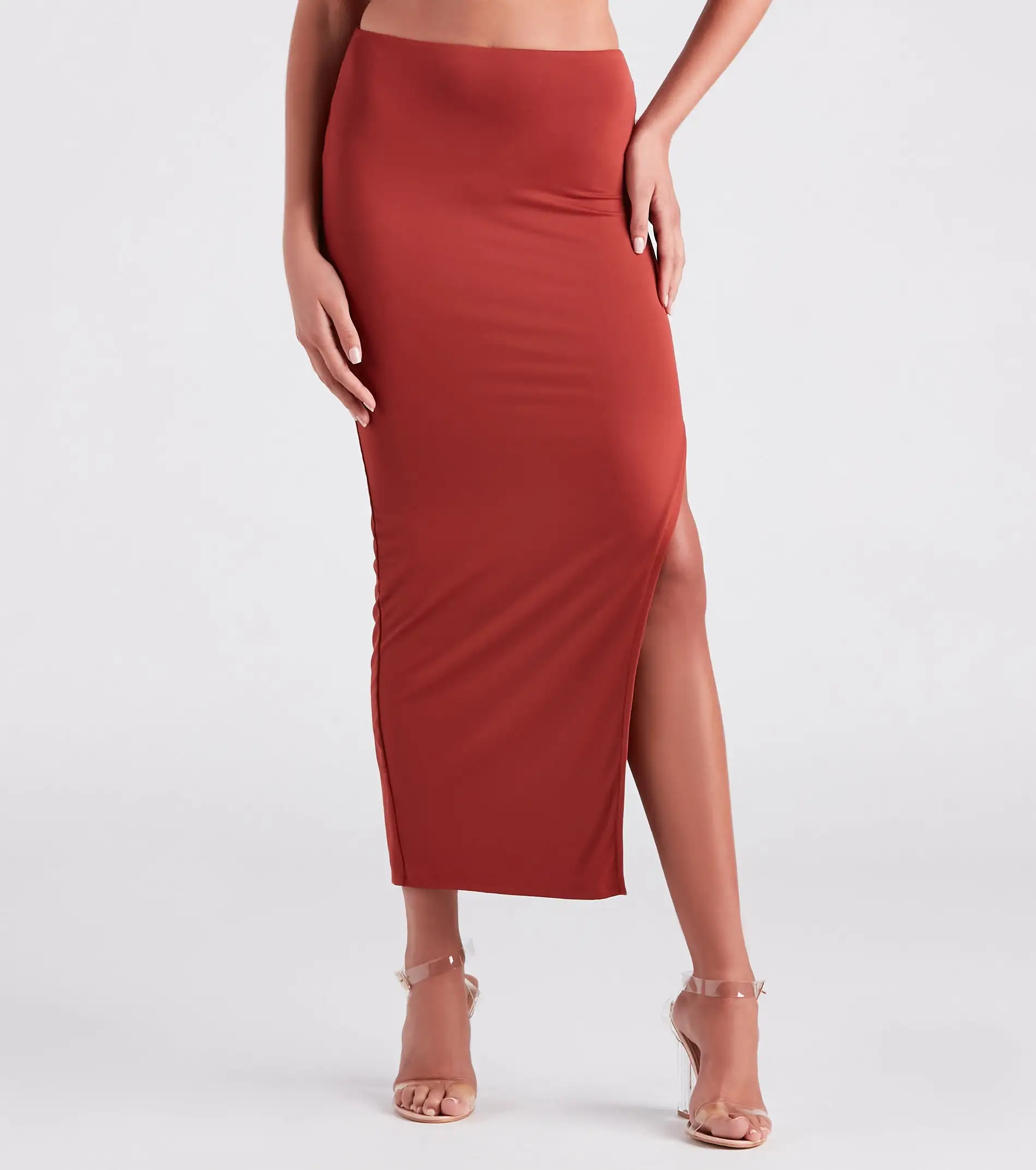 Create the perfect basics closet by adding this smooth knit midi skirt to your lineup! It features a sleek and flattering high-rise waist, a bodycon fit, and a sultry side high slit along the midi-length hem. The double-lined stretchy knit fabric offers a seamless design and has an ultra-butterfly feel. Style with the matching top for a complete look!