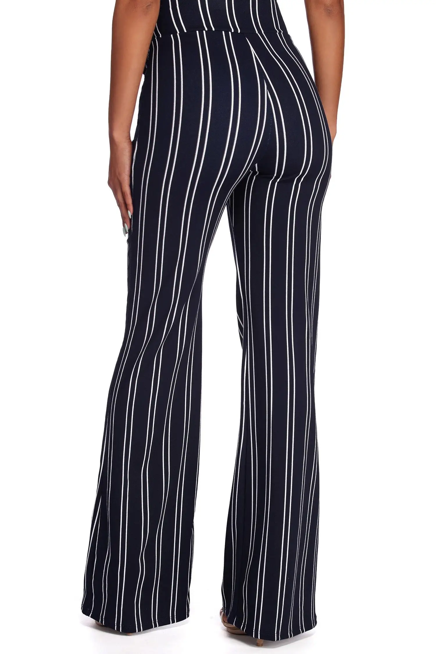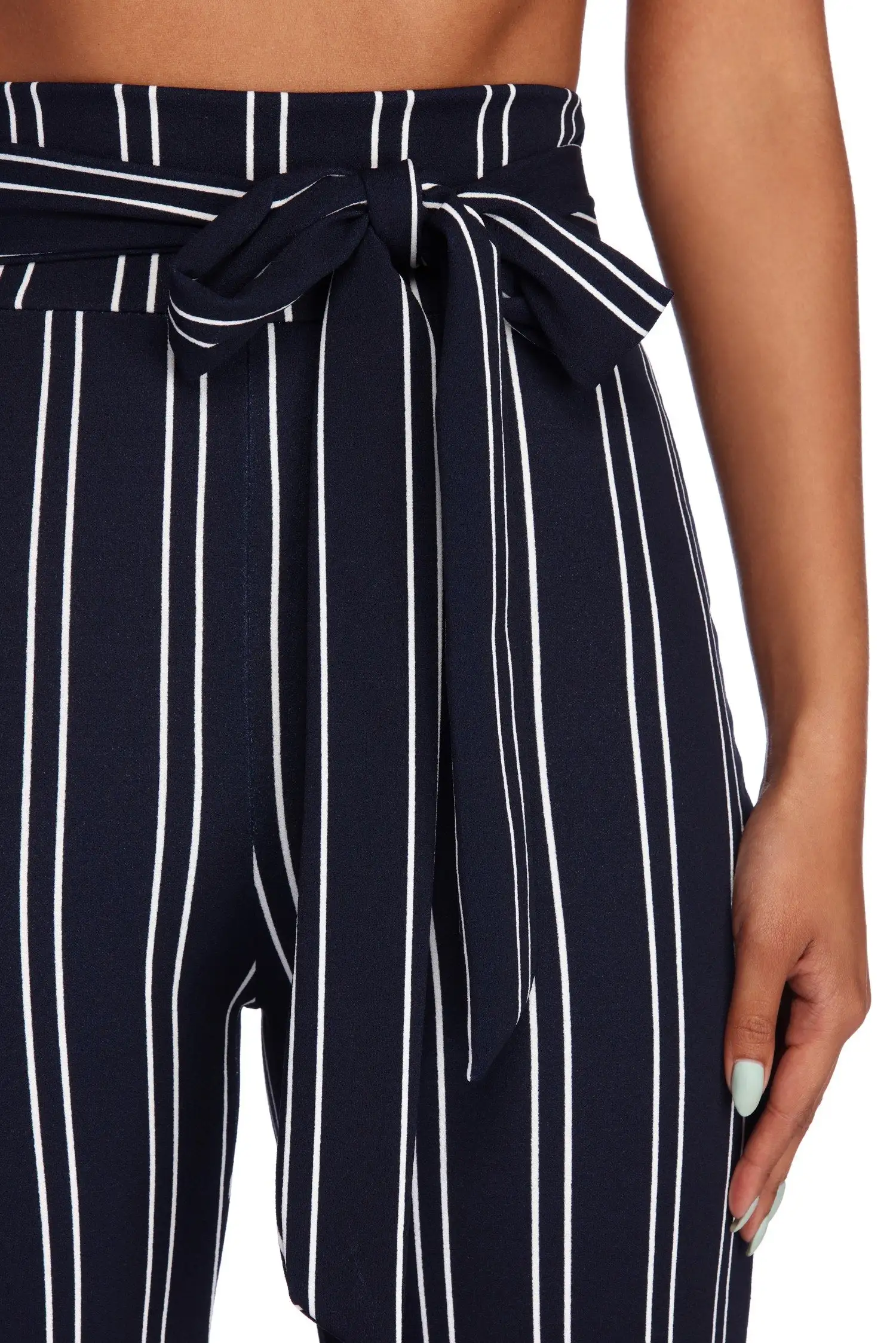 Climb up the social ladder with sophisticated style! These navy blue pants feature a high rise fit with a tie waist, contrasting thin white stripes, and a straight leg fit. Pants are composed of a crepe fabric with a moderate stretch.