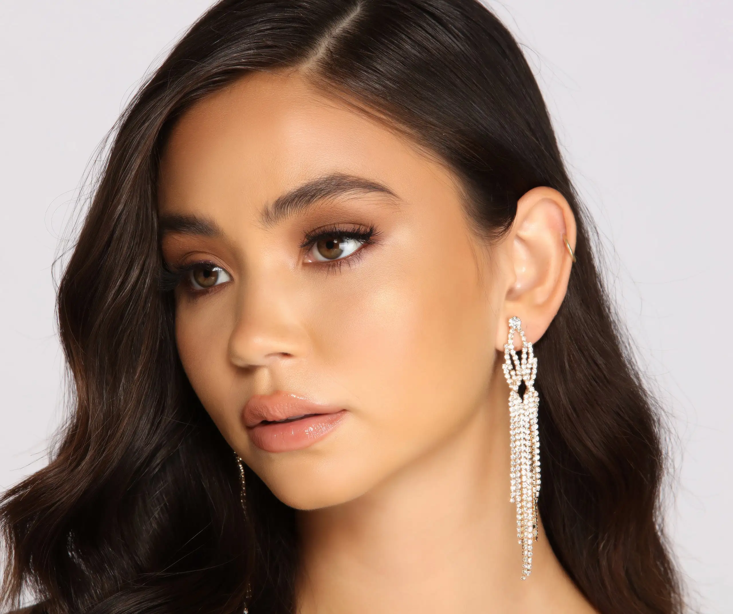 Sparkle it up in these gorgeous rhinestone duster earrings! They feature a rhinestone stud with an intricate design of rhinestones leading to cascading fringe. Pair with a sultry LBD and some