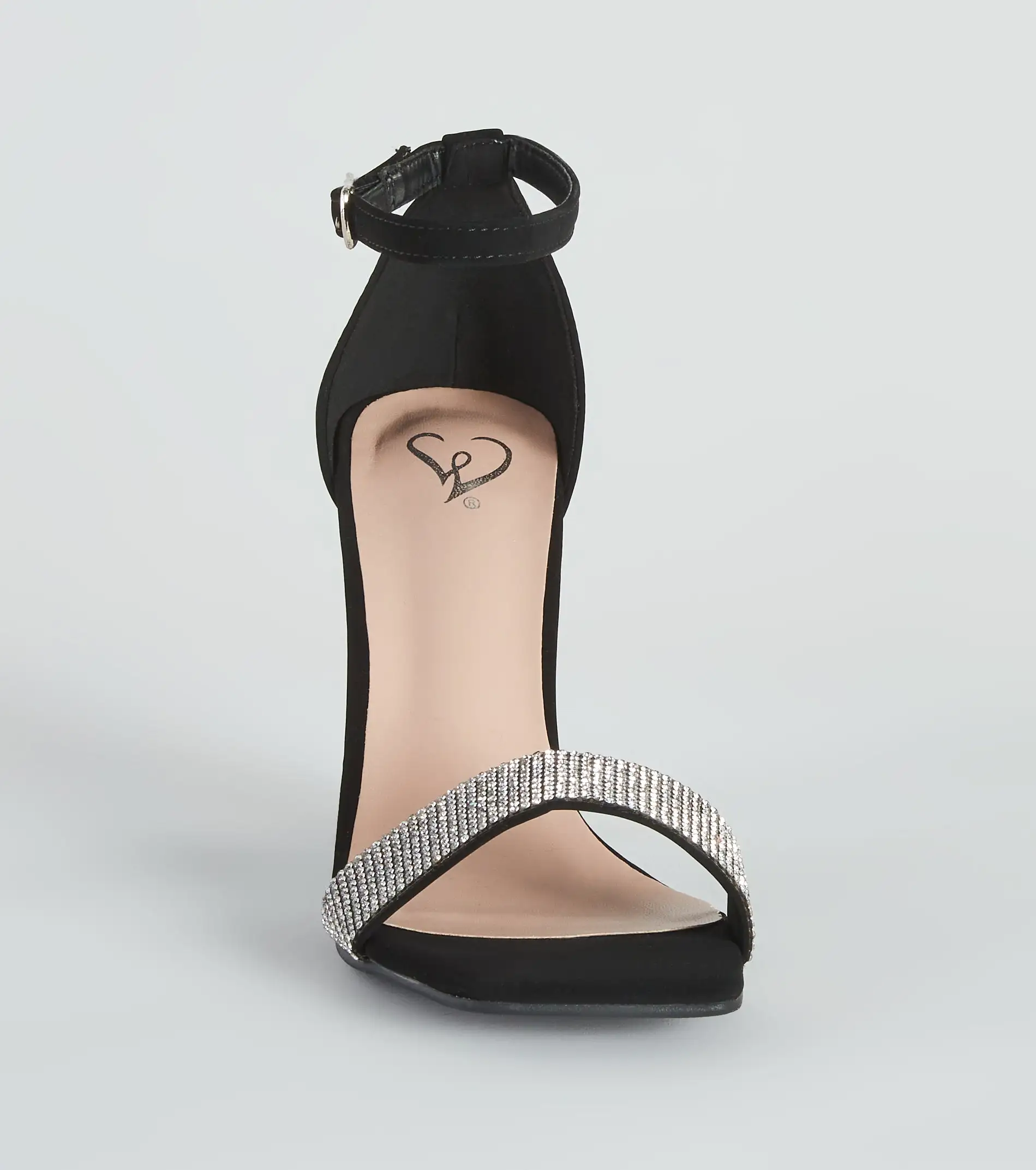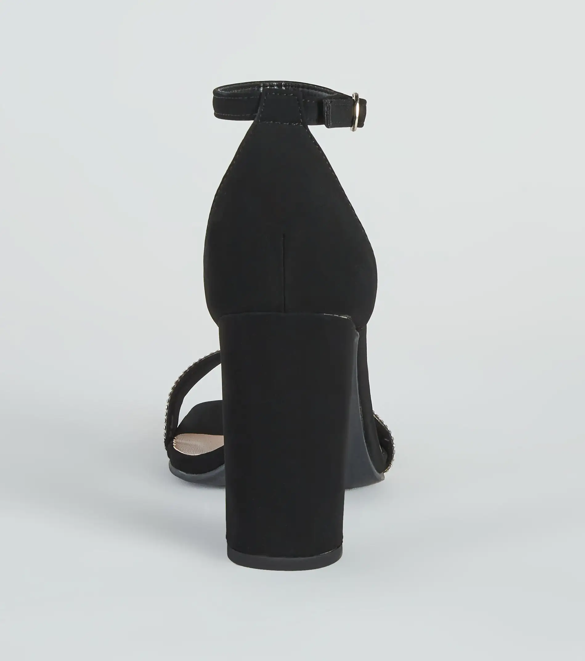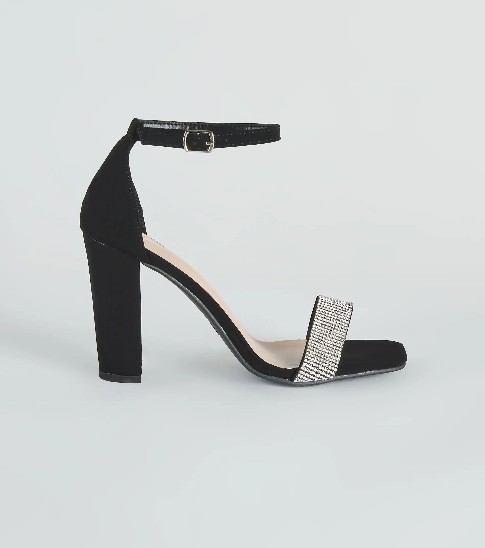 A block heel that unlocks your inner sparkling beauty! They feature a square toe, a rhinestone embellished toe strap, a closed ankle, and an adjustable ankle strap with buckle closure. Complete the look with a glitzy
