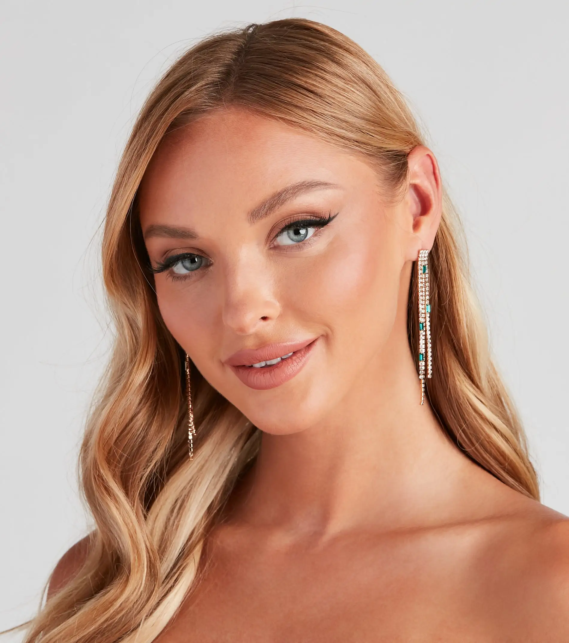 Can you spot the emerald? Glam from your ears in these earrings featuring rhinestone fringe and a post-back closure. Complete the look in matching sparkly