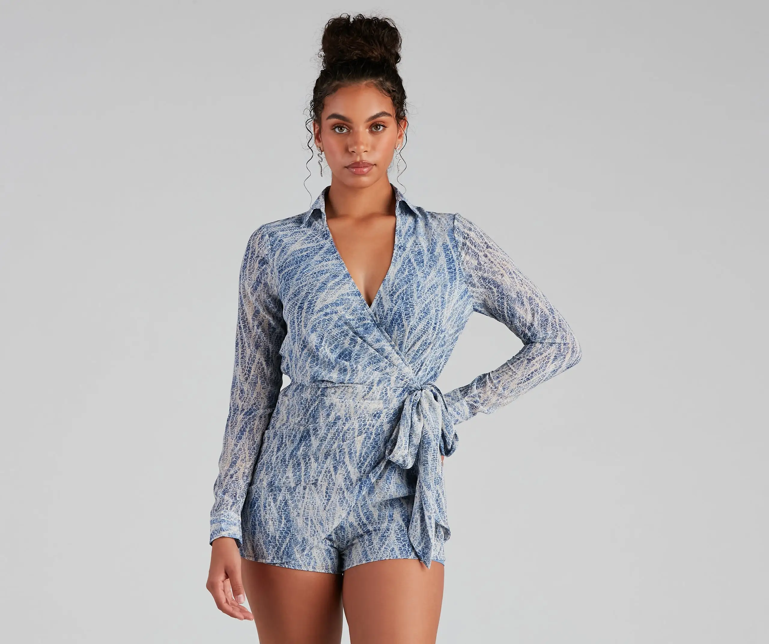 Bring on the warmer temps in this stylish chiffon romper perf for brunches! It features long sleeves, a collared v-neck, a surplice bodice with tie closure, and a snake pattern. Composed of non-stretch chiffon fabric with an inner knit lining. Style with lace-up