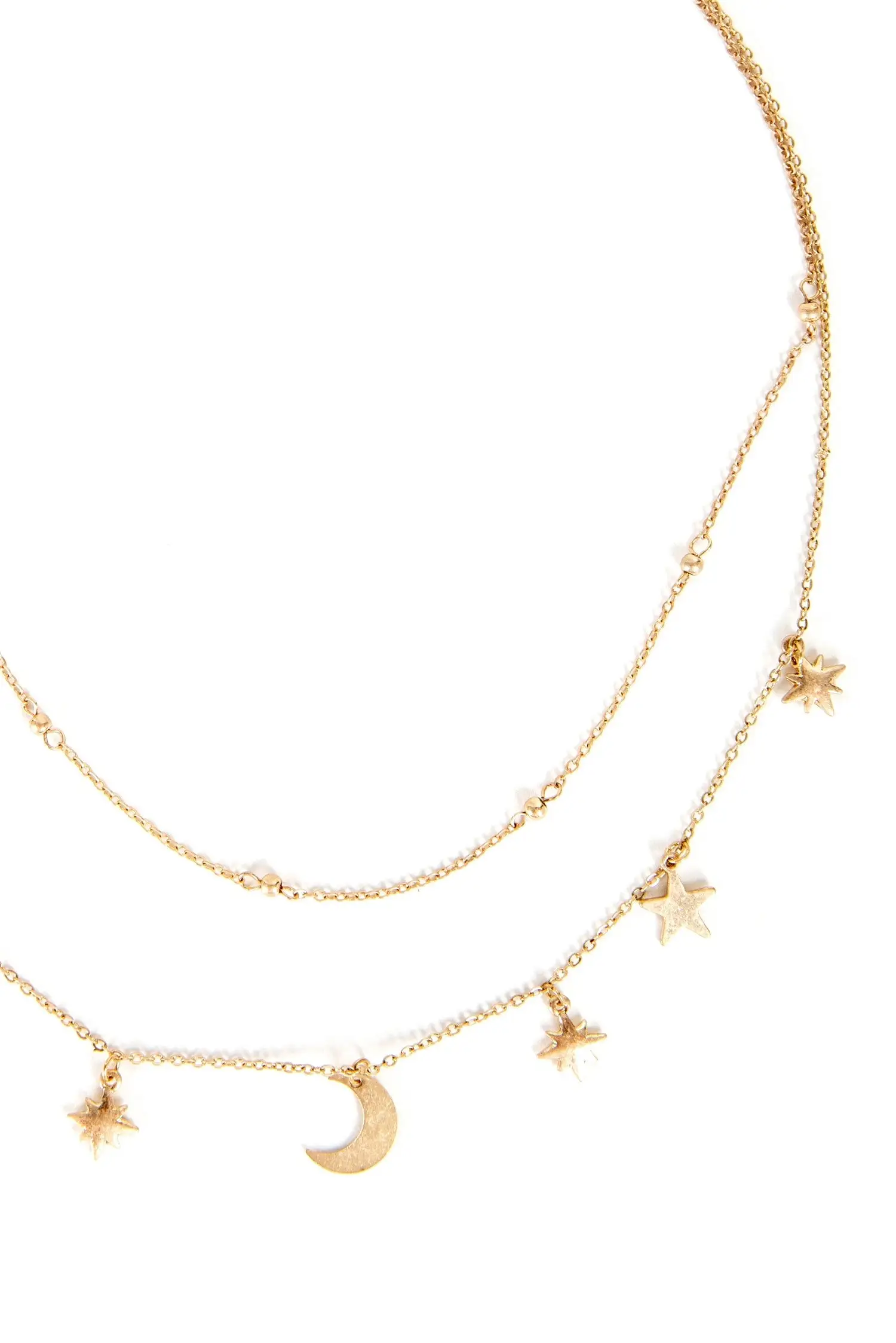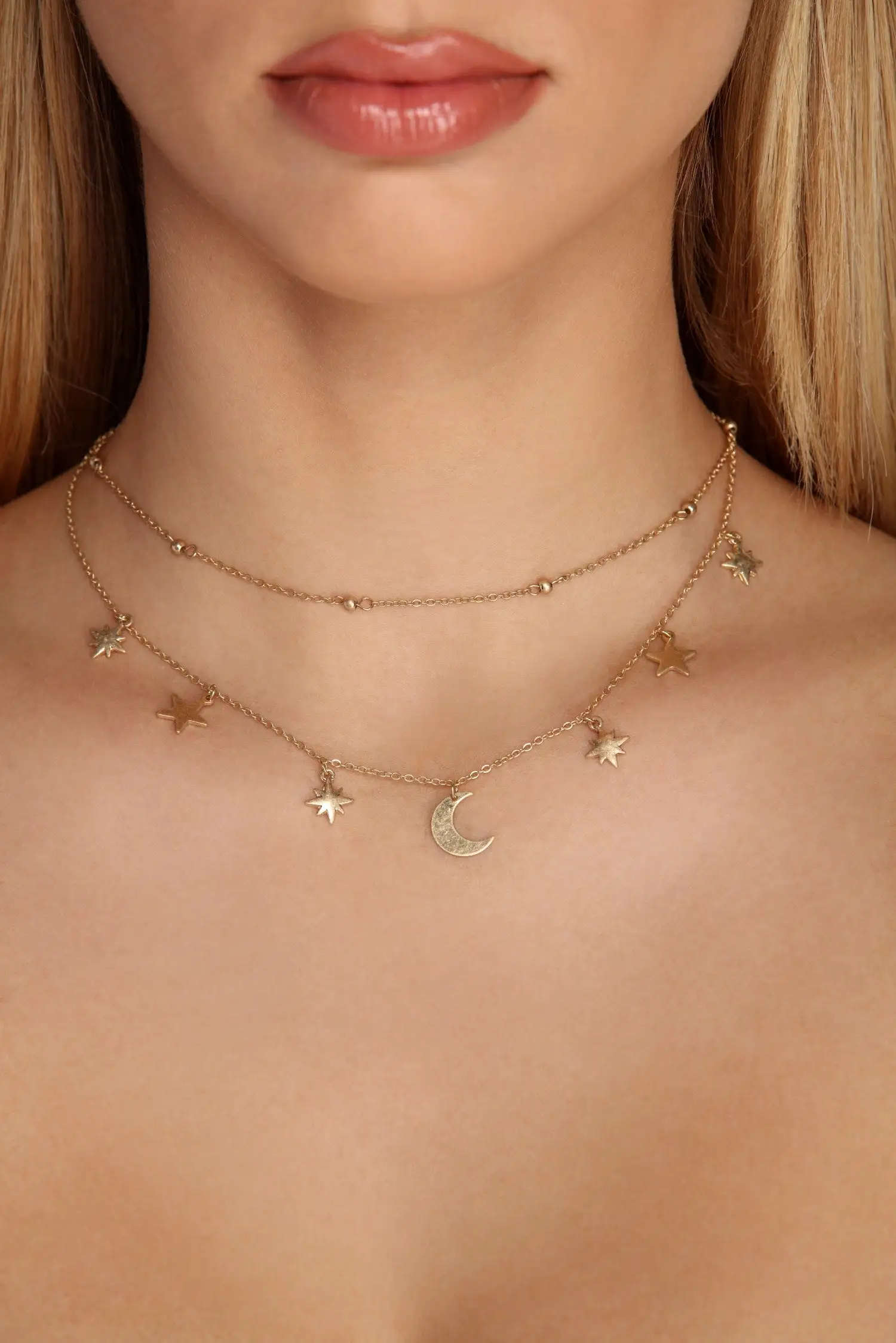 Shine bright in this star and moon charm layered necklace! It features two rows of dainty gold chains, the shorter row featuring a ball and chain design, and the longer layer showcasing star charms and a single center moon charm. Includes an adjustable lobster clasp closure.