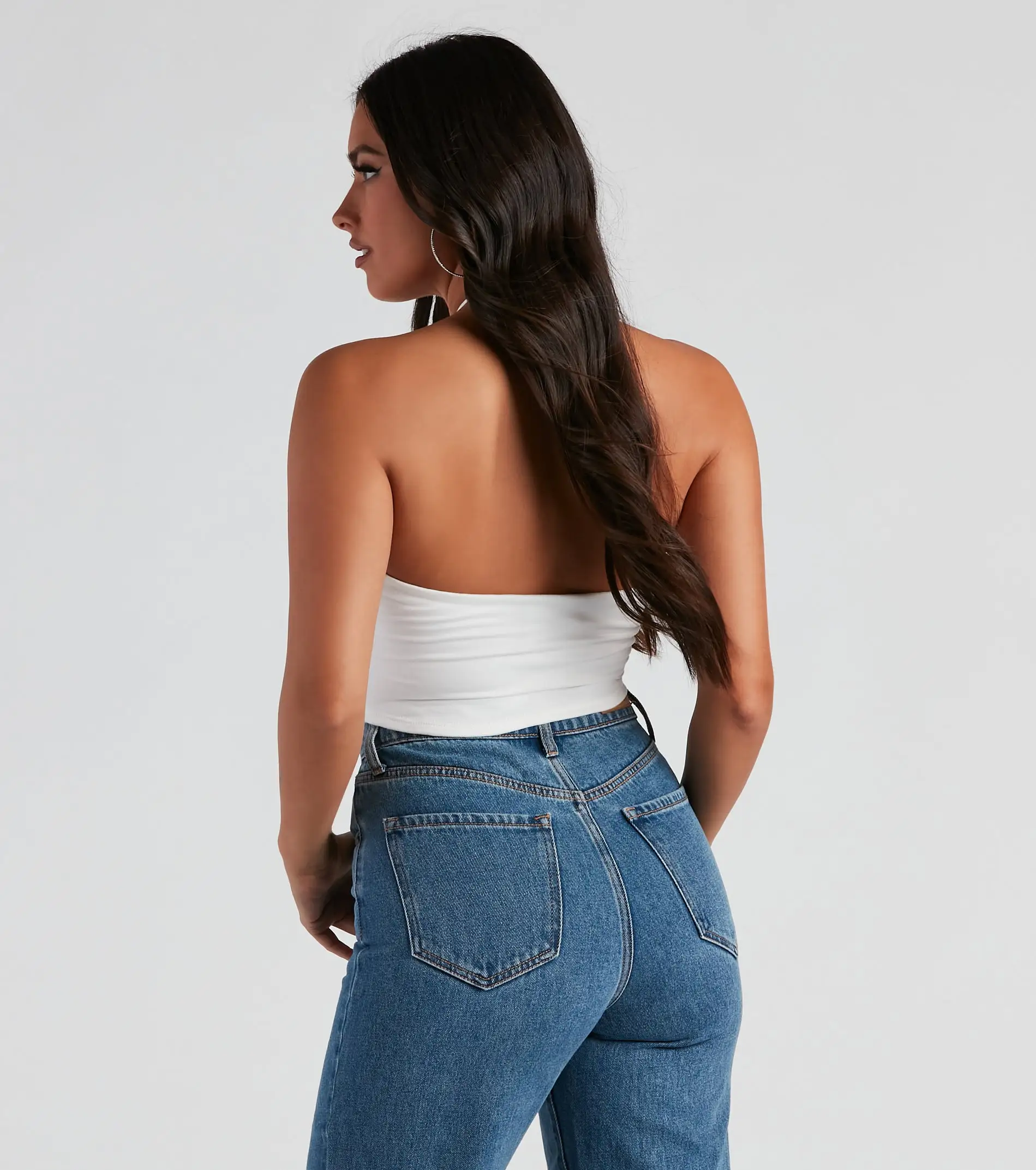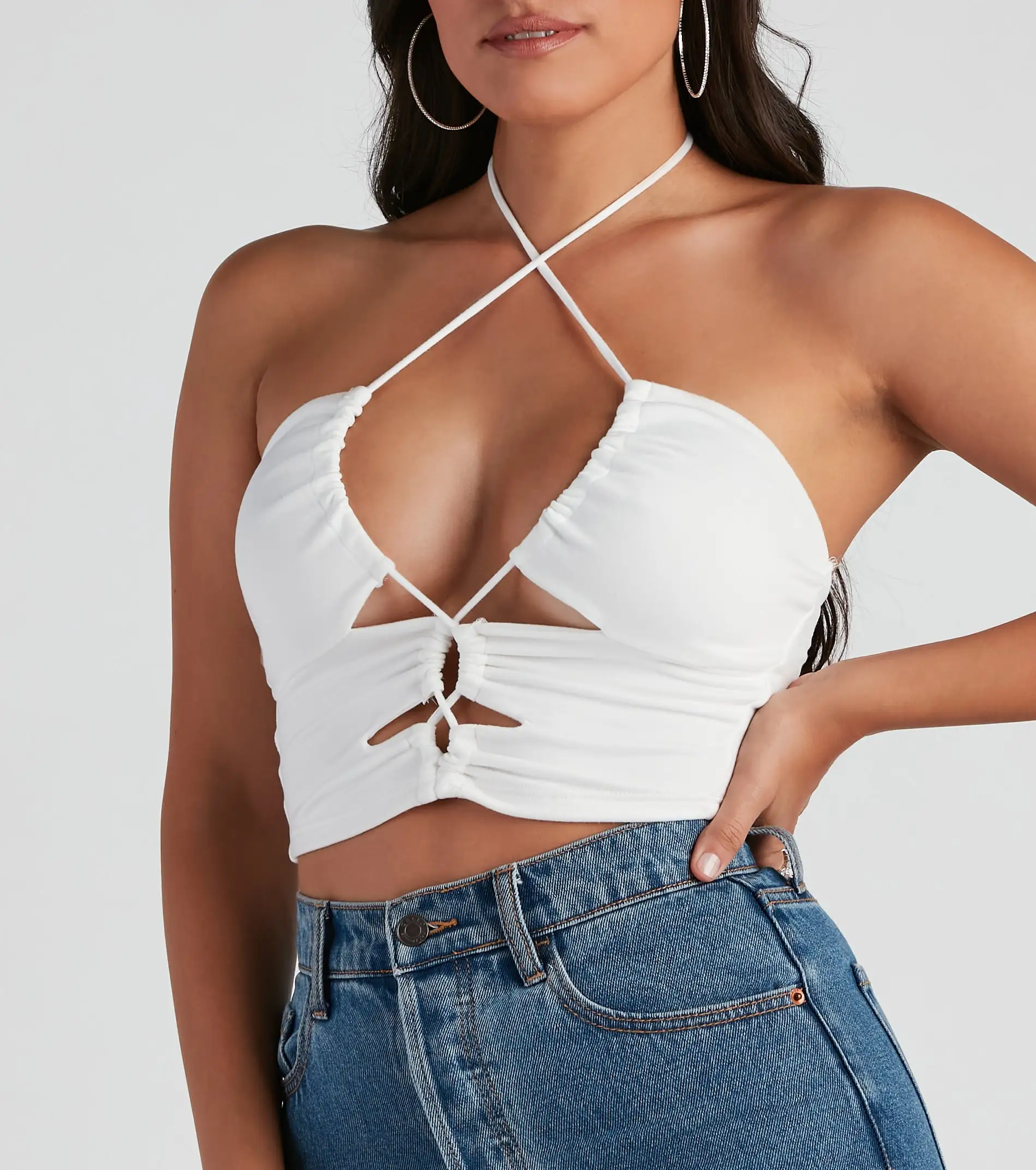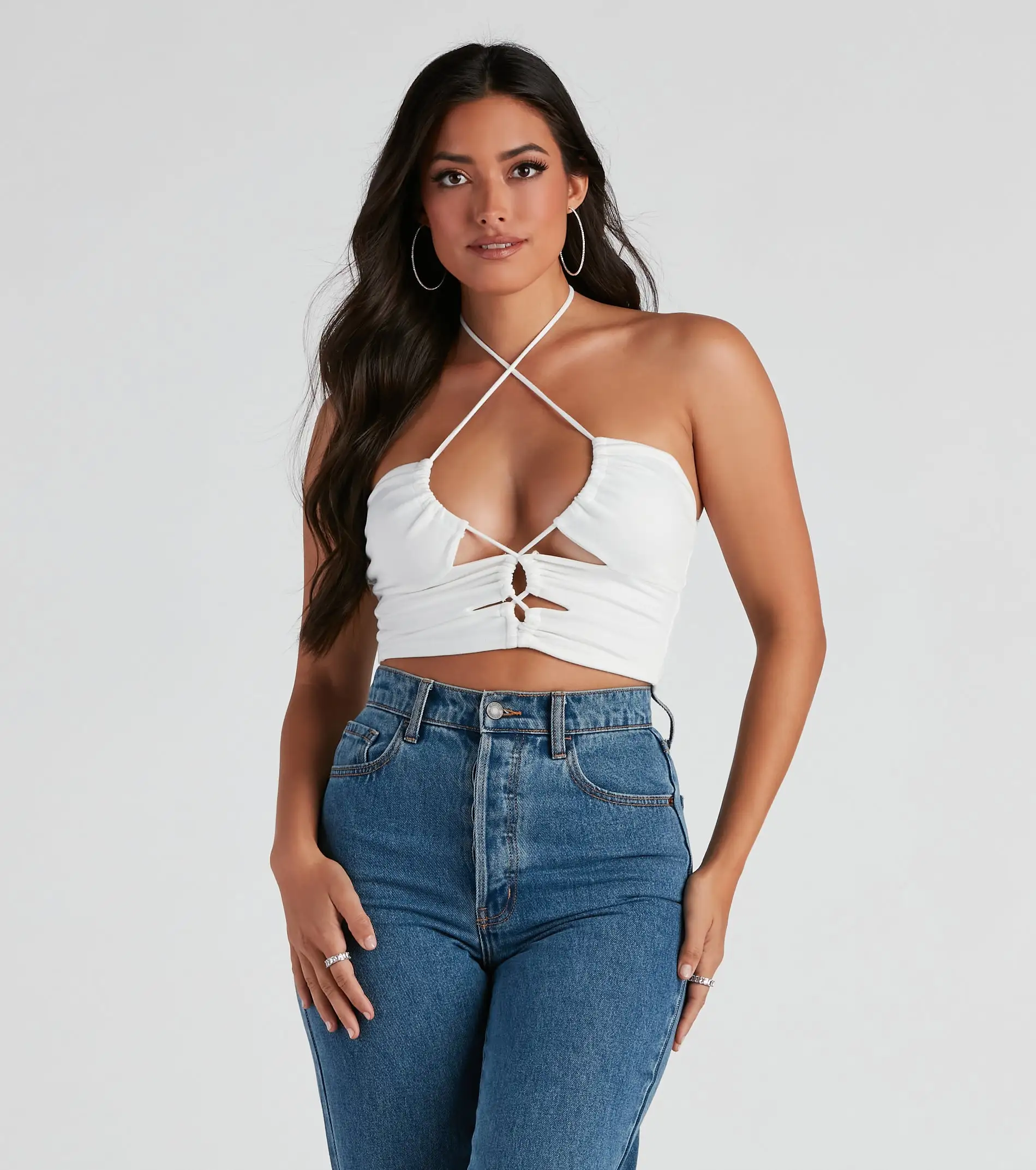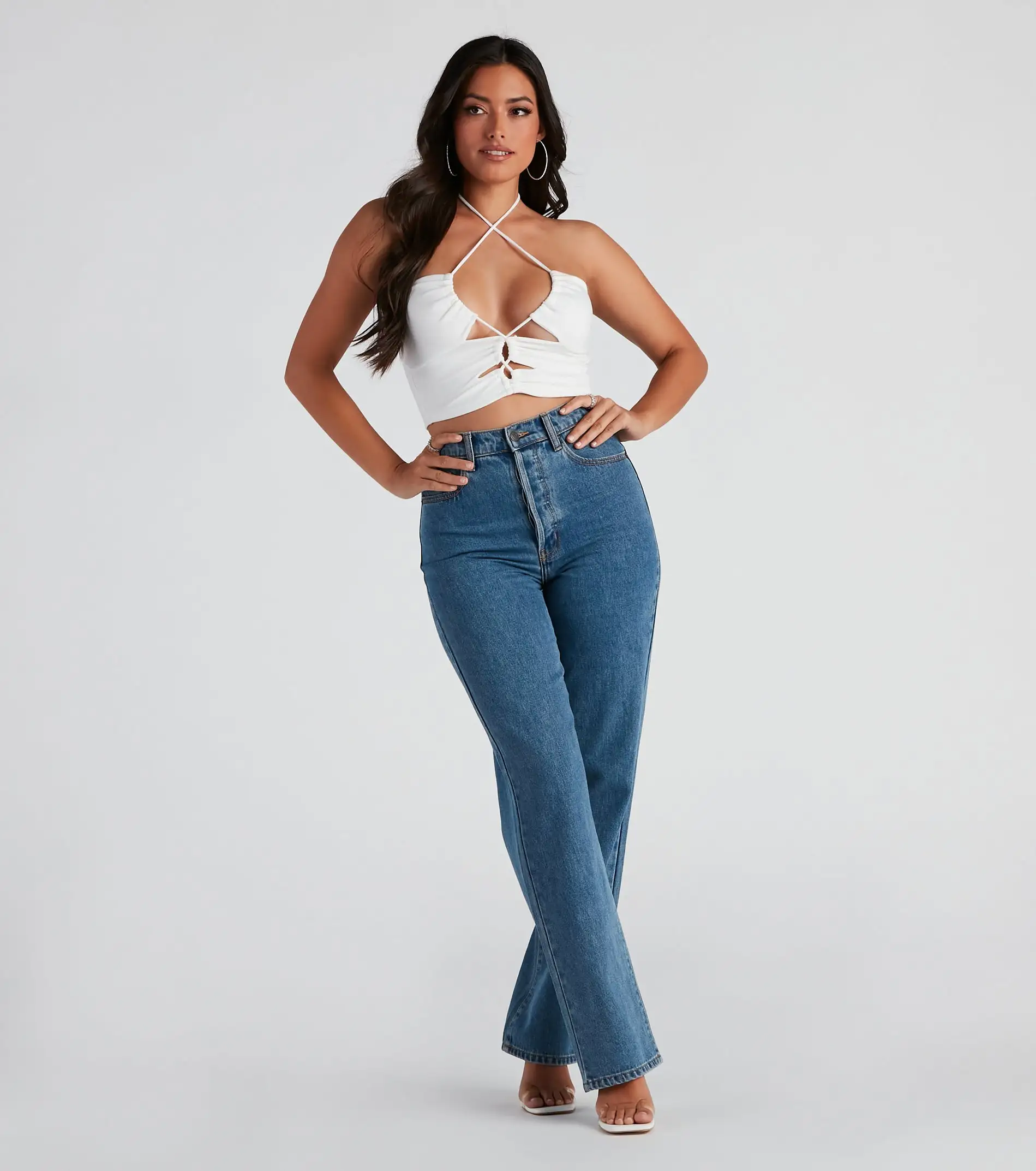 This halter top comes with strings attached. It features a sleeveless, plunge neck with tie closure, an eye-catching drawstring lace-up, and a partial open-back design. Complete your summer look in flared boho