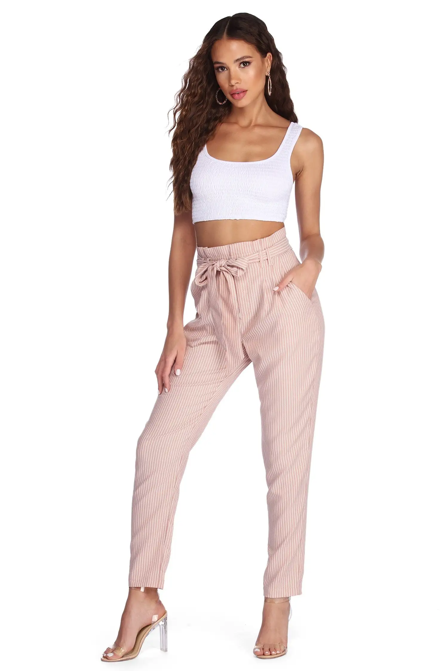 You’ll love these blush paper bag pants so much, you’ll swipe right on it! It features a high waist, a tie waist, a hidden zipper and hook and bar closure, slanted front pockets, faux back pockets, and a comfortable tapered fit. Pants are composed of a woven fabric with no stretch.