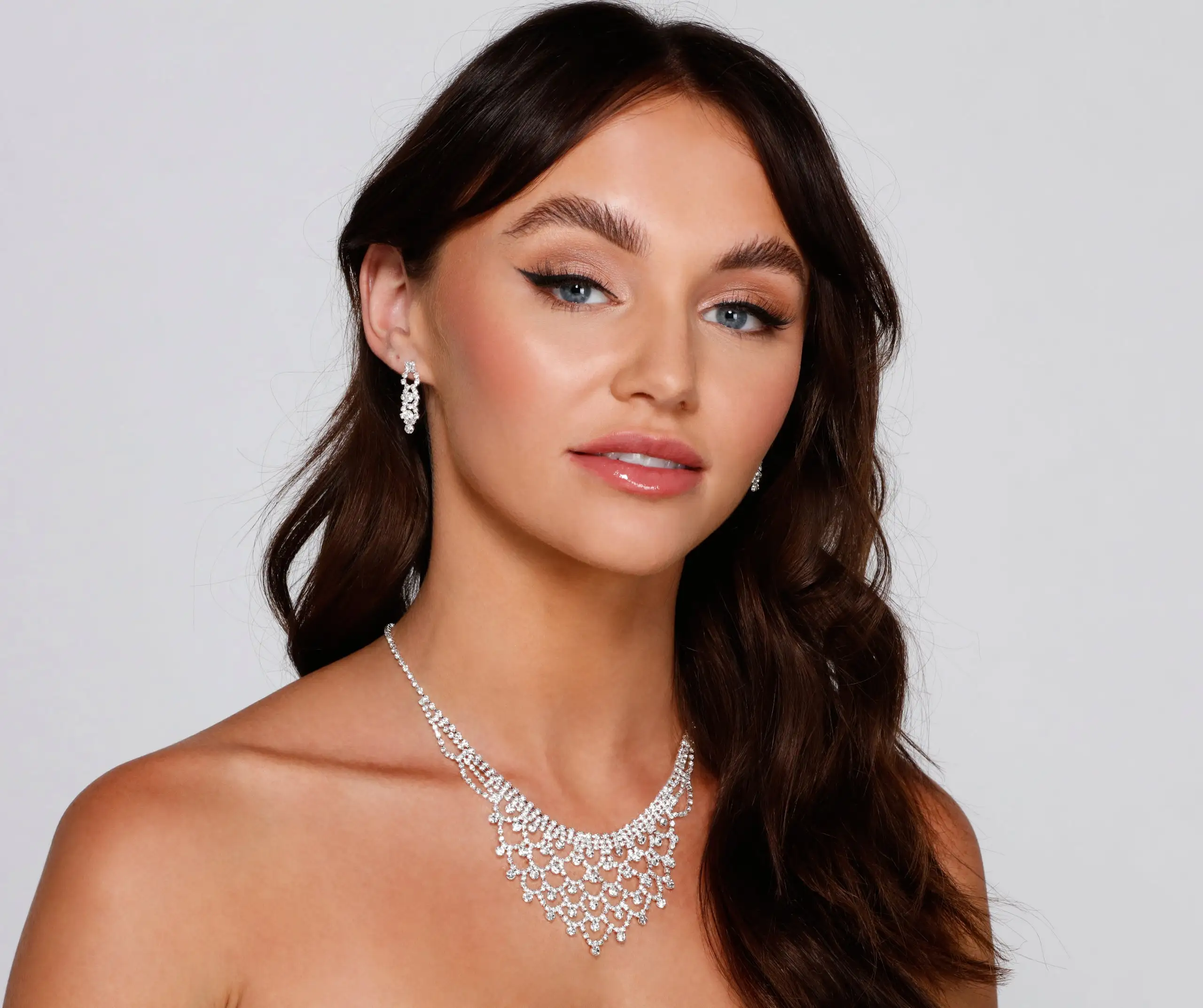 You’ll stay sparkling all night long in this necklace and earrings set! They feature floral accents finished with rhinestones. Wear them with a