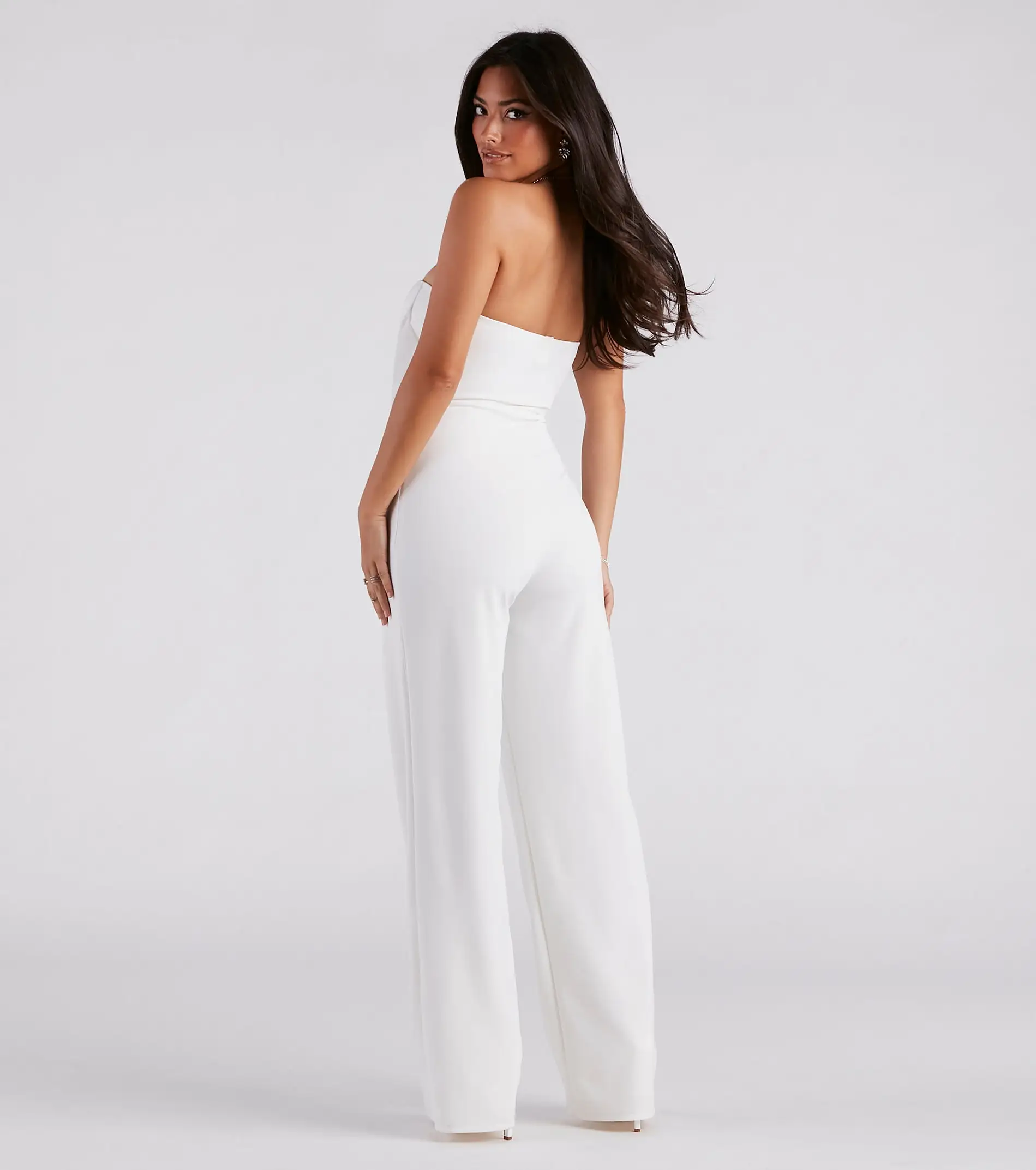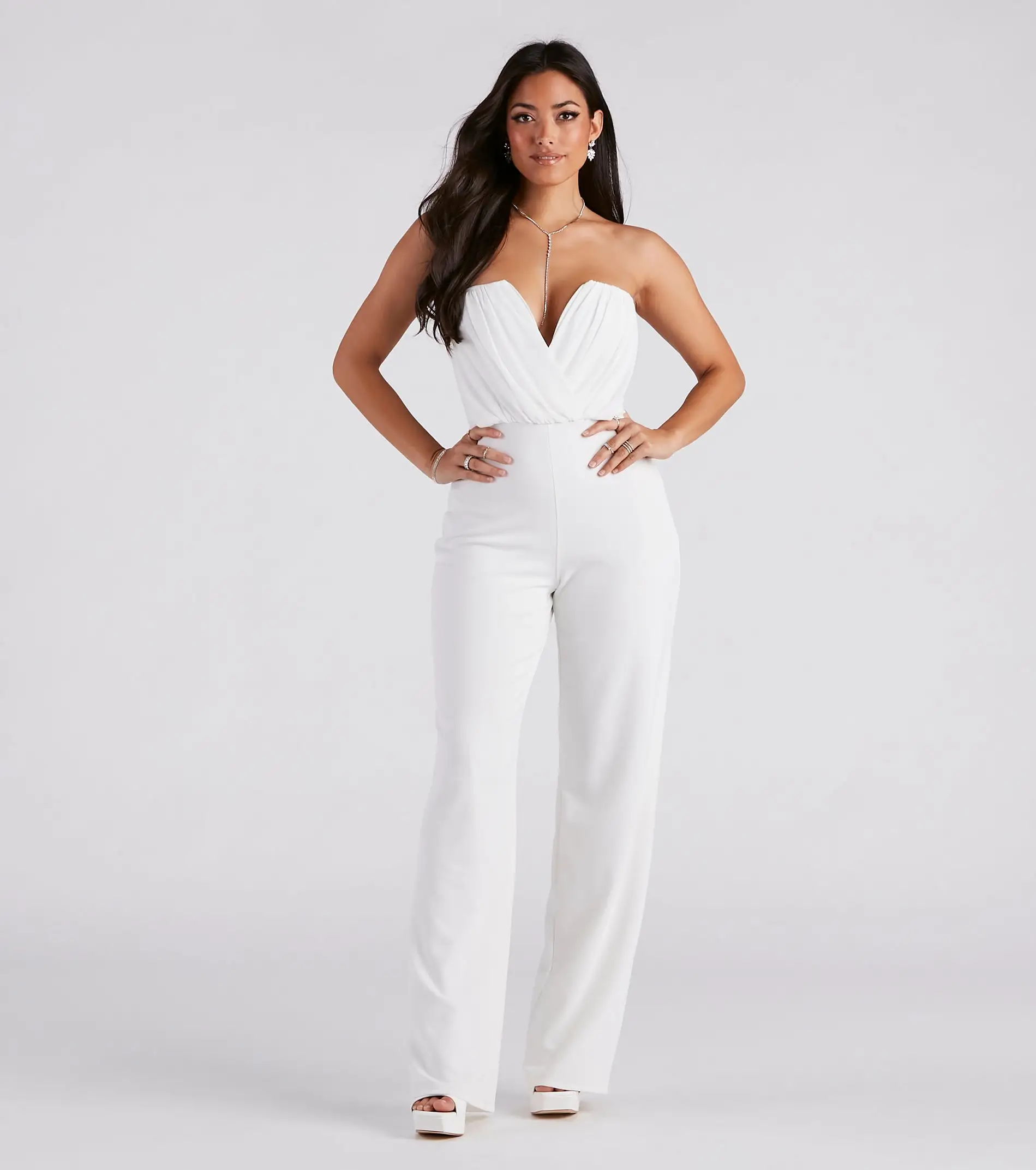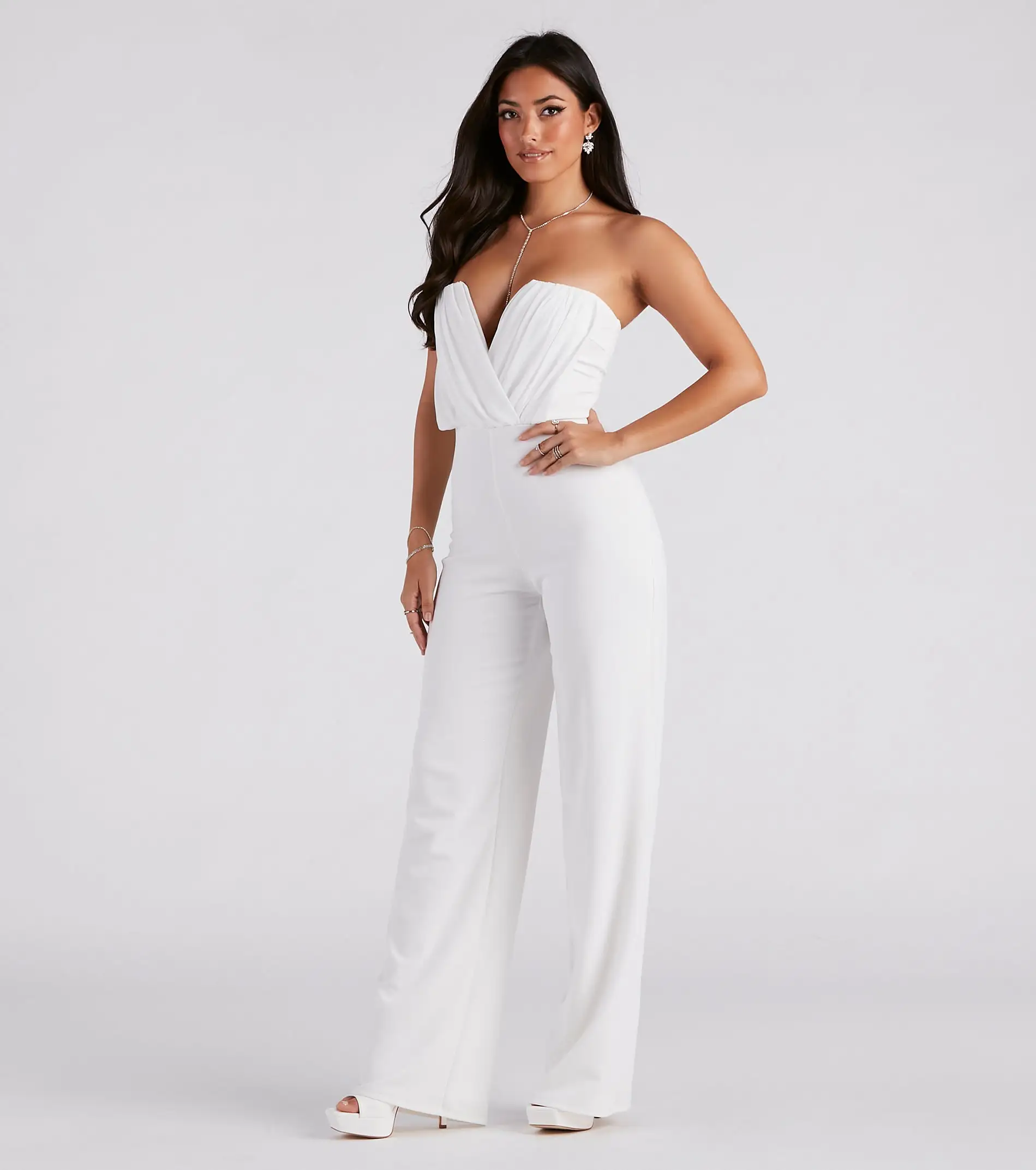Calling all brides! This chiffon knit jumpsuit is the perfect chic pick for bridal showers, bachelorette festivities, or rehearsal dinners. It features a strapless plunging V-wired neckline with a pleated wrap-front design and a sheer chiffon overlay, a high waist, a hip-hugging fit, and a wide-leg silhouette. The crepe fabric includes a full knit lining and offers moderate stretch. Style this jumpsuit with a rhinestone lariat necklace and