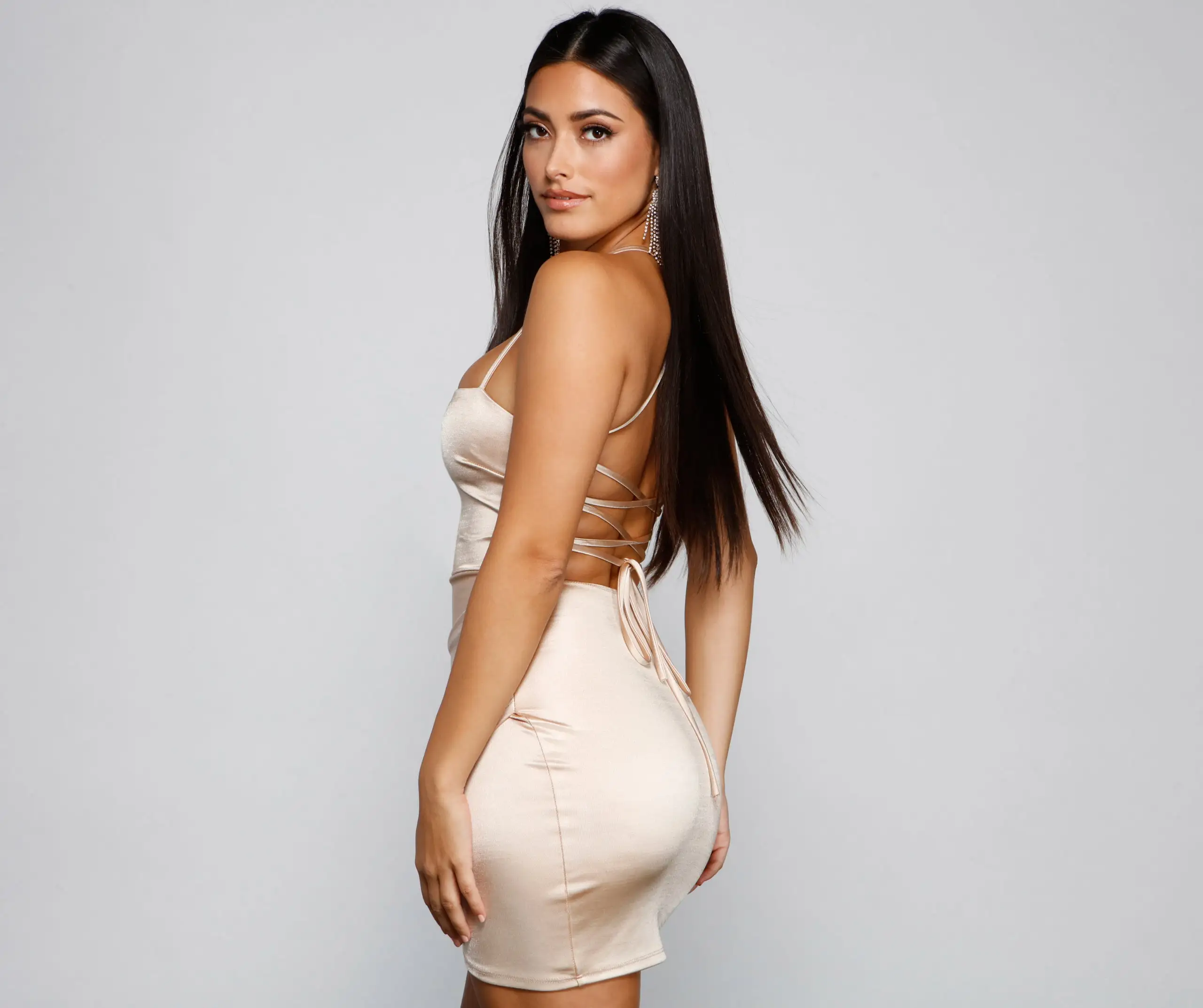 Get a sultry look for your next night out in this sleek satin mini dress. It features a sleeveless bodice, spaghetti straps, a square neckline, a strappy back design, front ruching, and a wrap-front skirt with a mini-length, curve-hugging silhouette. Complete the outfit with clear heels and a
