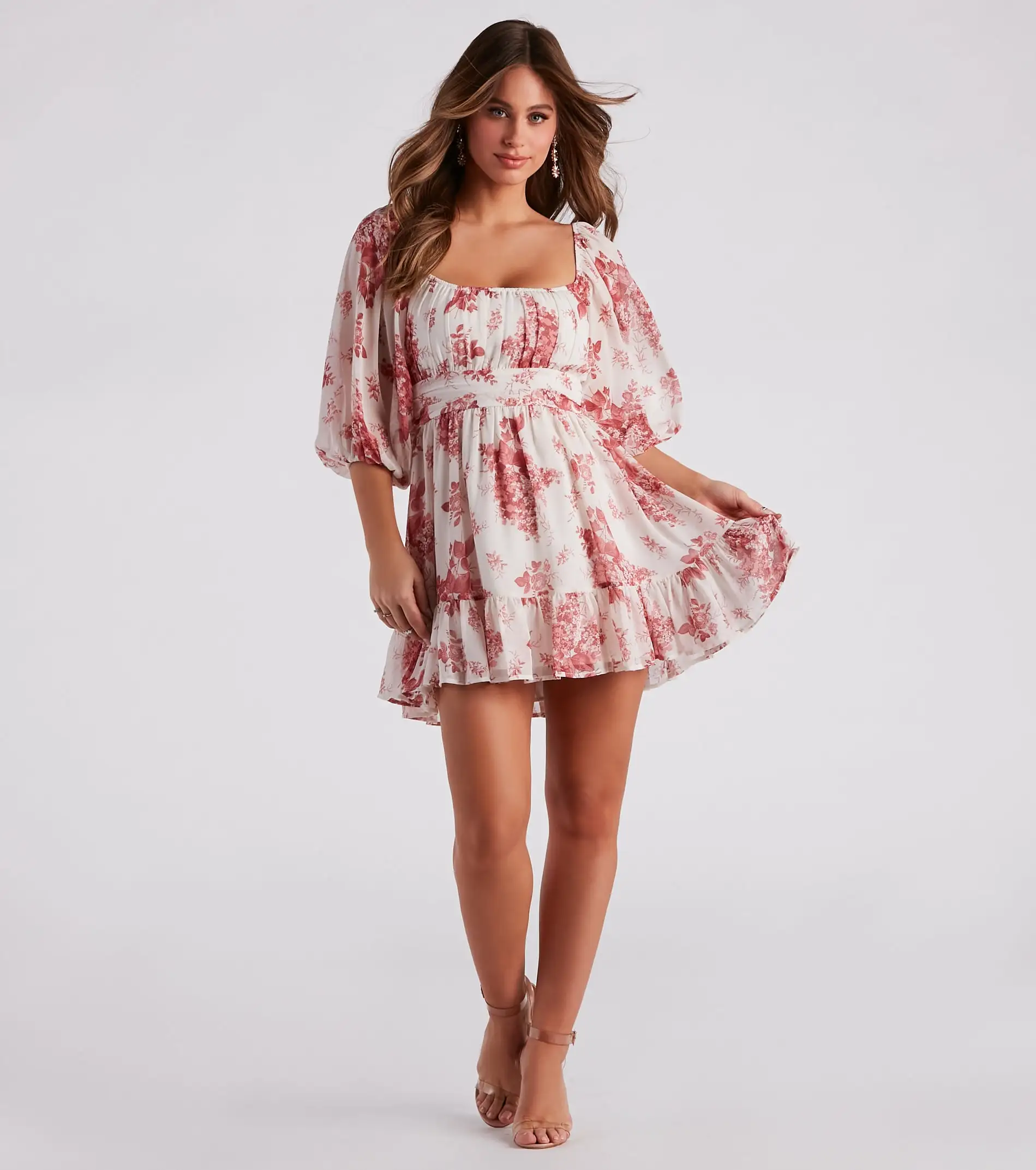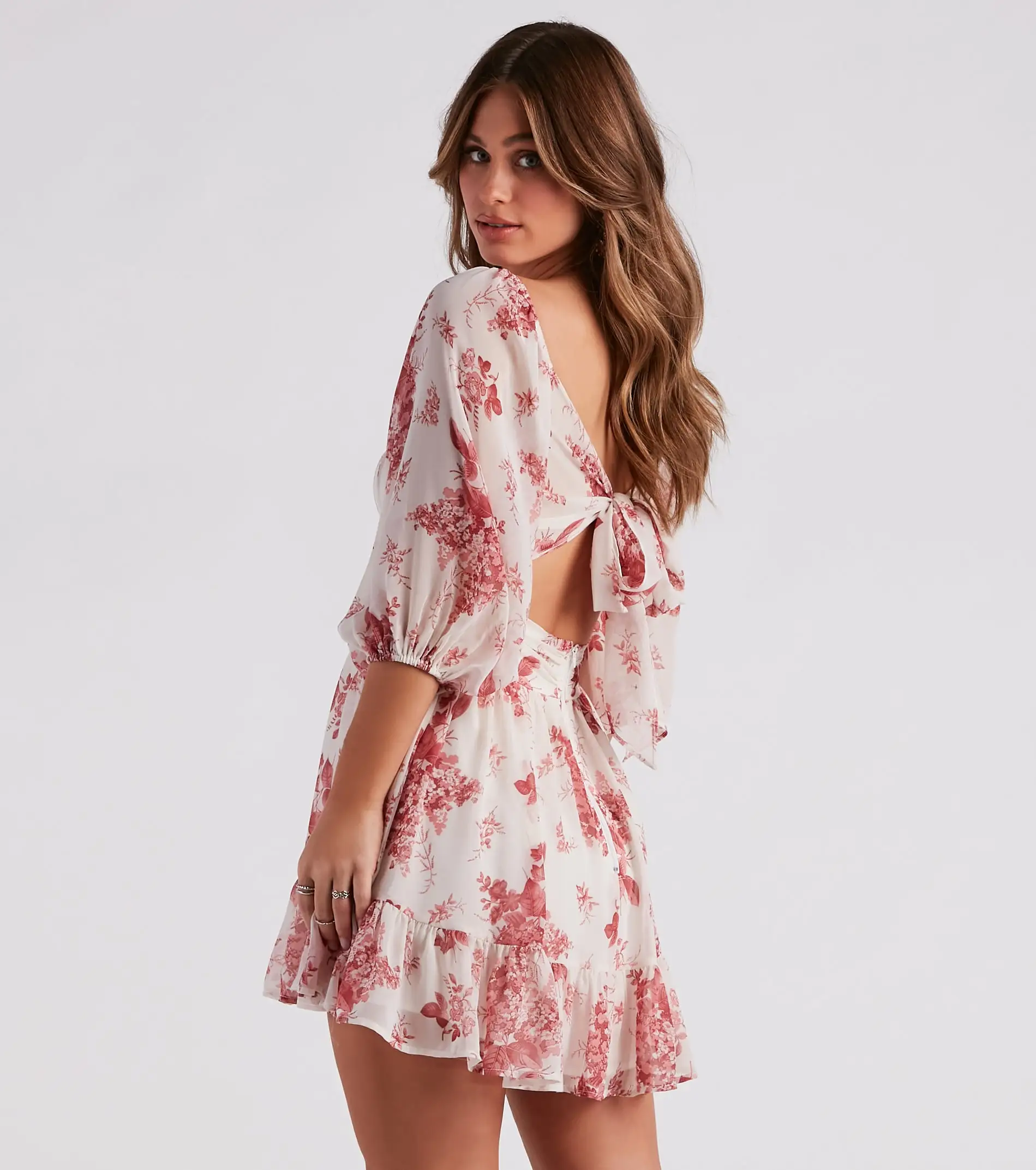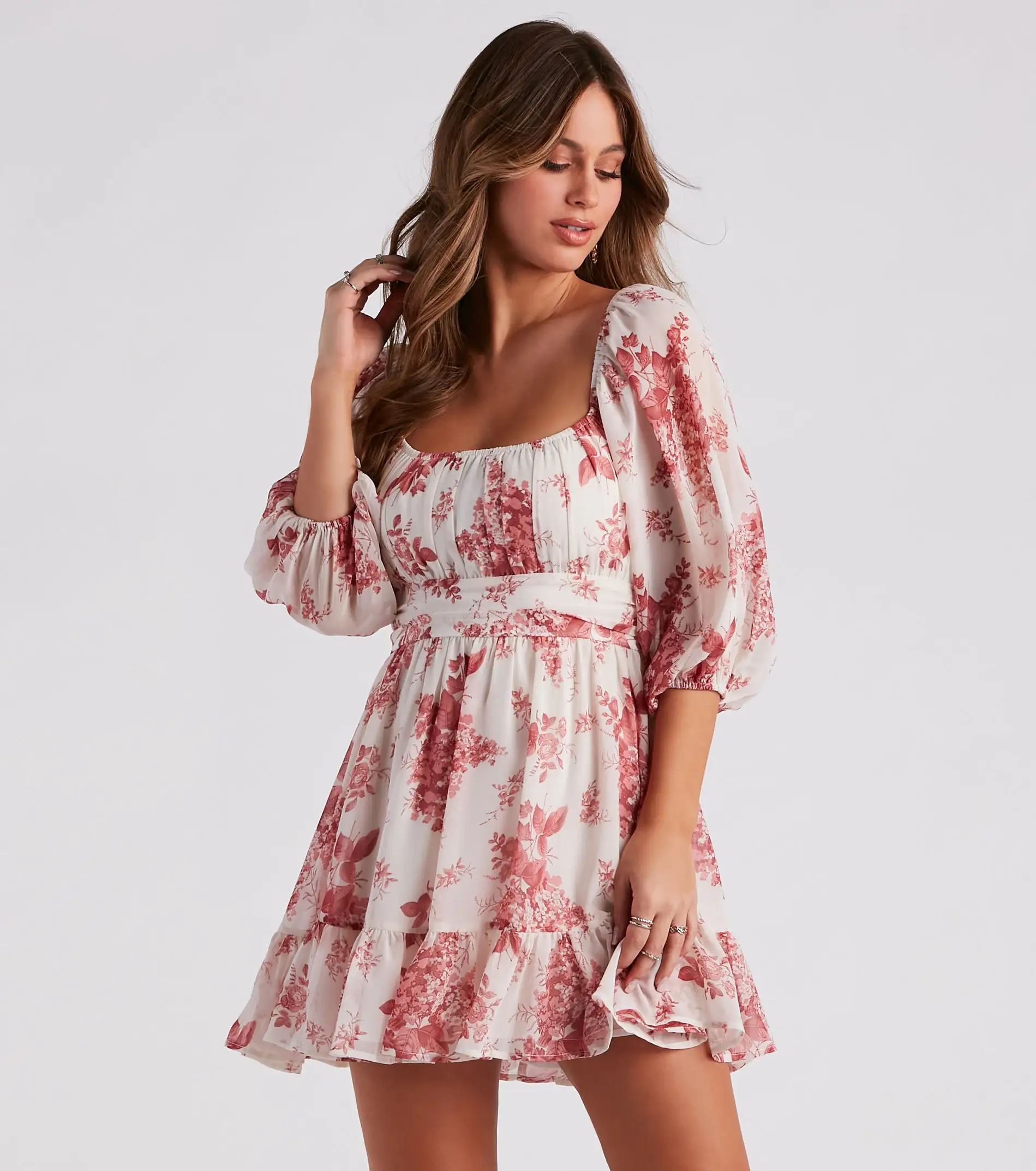Look cute for Sunday brunch in this floral chiffon skater dress featuring three-quarter length puff sleeves, a square neck, and a pleated waistband on the skater silhouette. Showcase a peek of skin in the open-back design with tie closure and ruffled short-length hem. Composed of a chiffon floral lined fabric with no stretch. Perfect for styling with knee-high