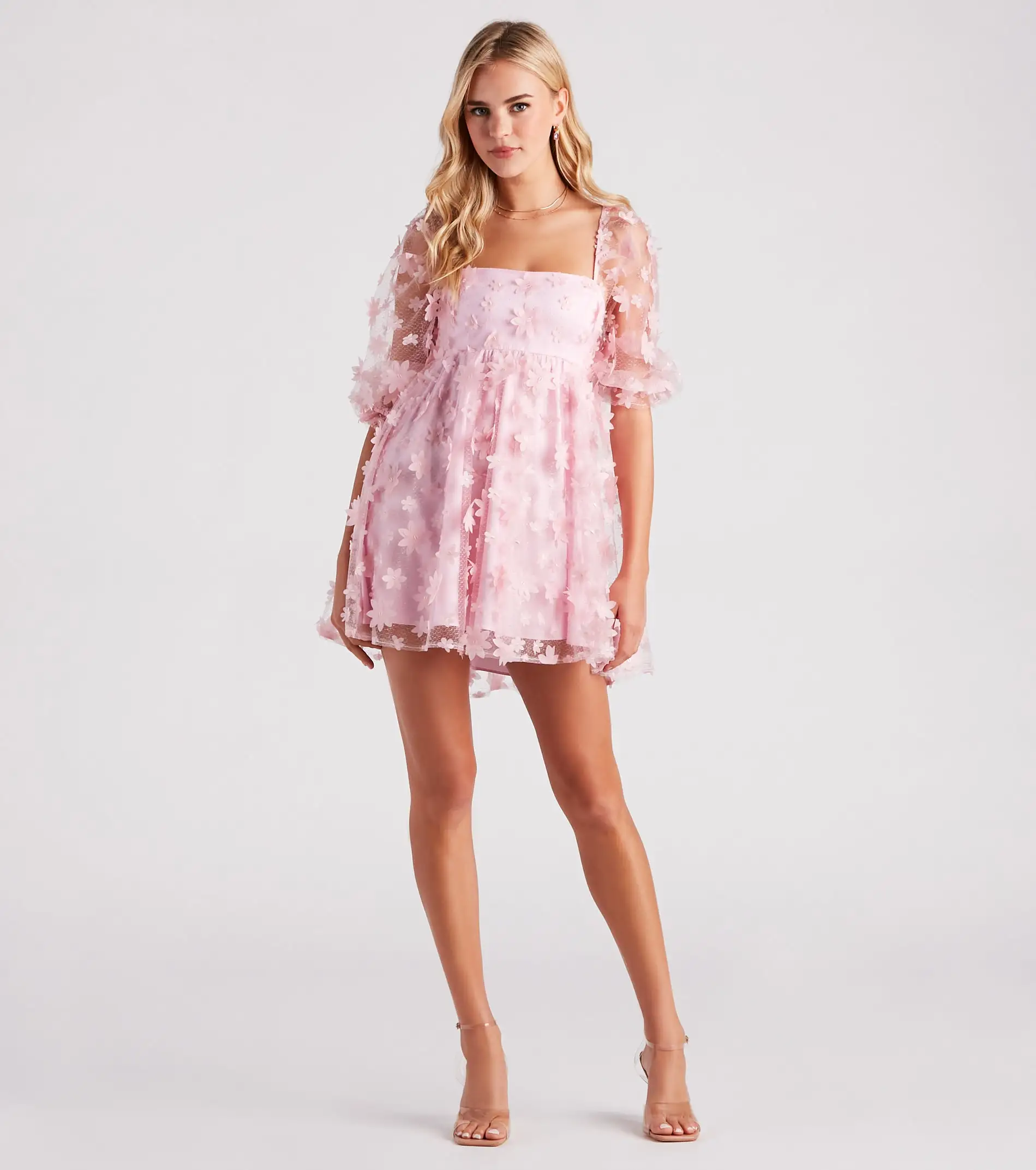 Embrace the sunshine looking fresh as a daisy in this flower skater dress perfect for all-day twirling! The dress features sheer mesh three-quarter-length puff sleeves, a square neckline, and a fit and flare, short-length hem. The dress is designed with all-over daisy flowers on glitter mesh fabric with a chiffon lining. Complete the look in