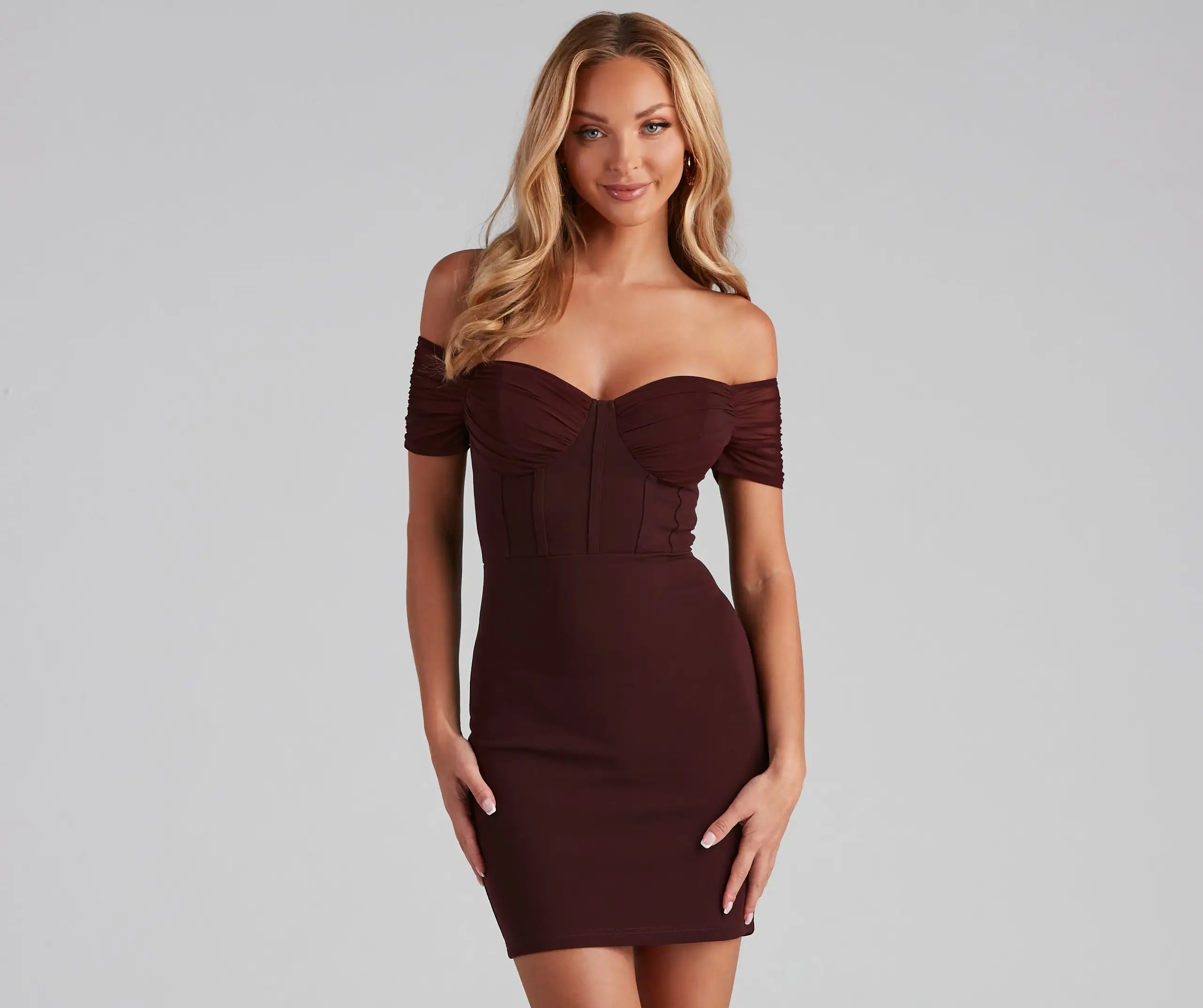Get a look that’s both sweet and sultry in this chic bodycon dress! It features an off the shoulder sweetheart neckline, a padded bust with a ruched sheer mesh fabric overlay, sheer mesh short fitted sleeves, and a back zipper and hook and eye closure. The dress showcases a front corset-like design and has a high waist seam leading to a curve-hugging, mini-length silhouette. Style this dress with strappy heels and apply some