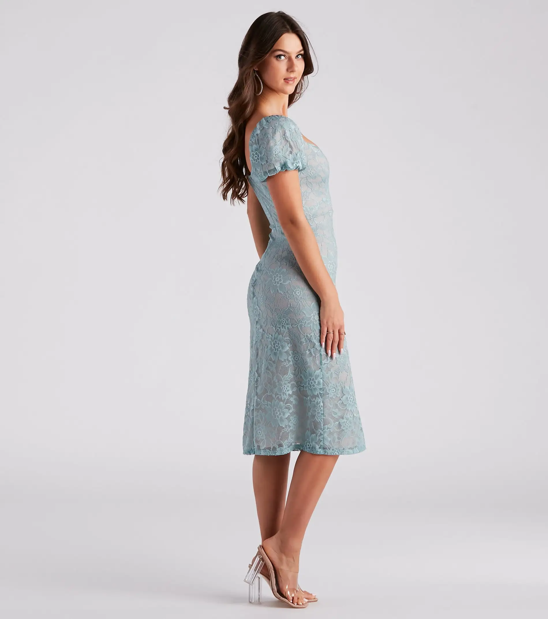 Look and feel sweet as can be in this lace midi dress for a chance at romance! Features adorable short puff sleeves, a sweetheart neckline, a form-hugging silhouette, a flirty front slit, and a slight flare hem. Style with heeled