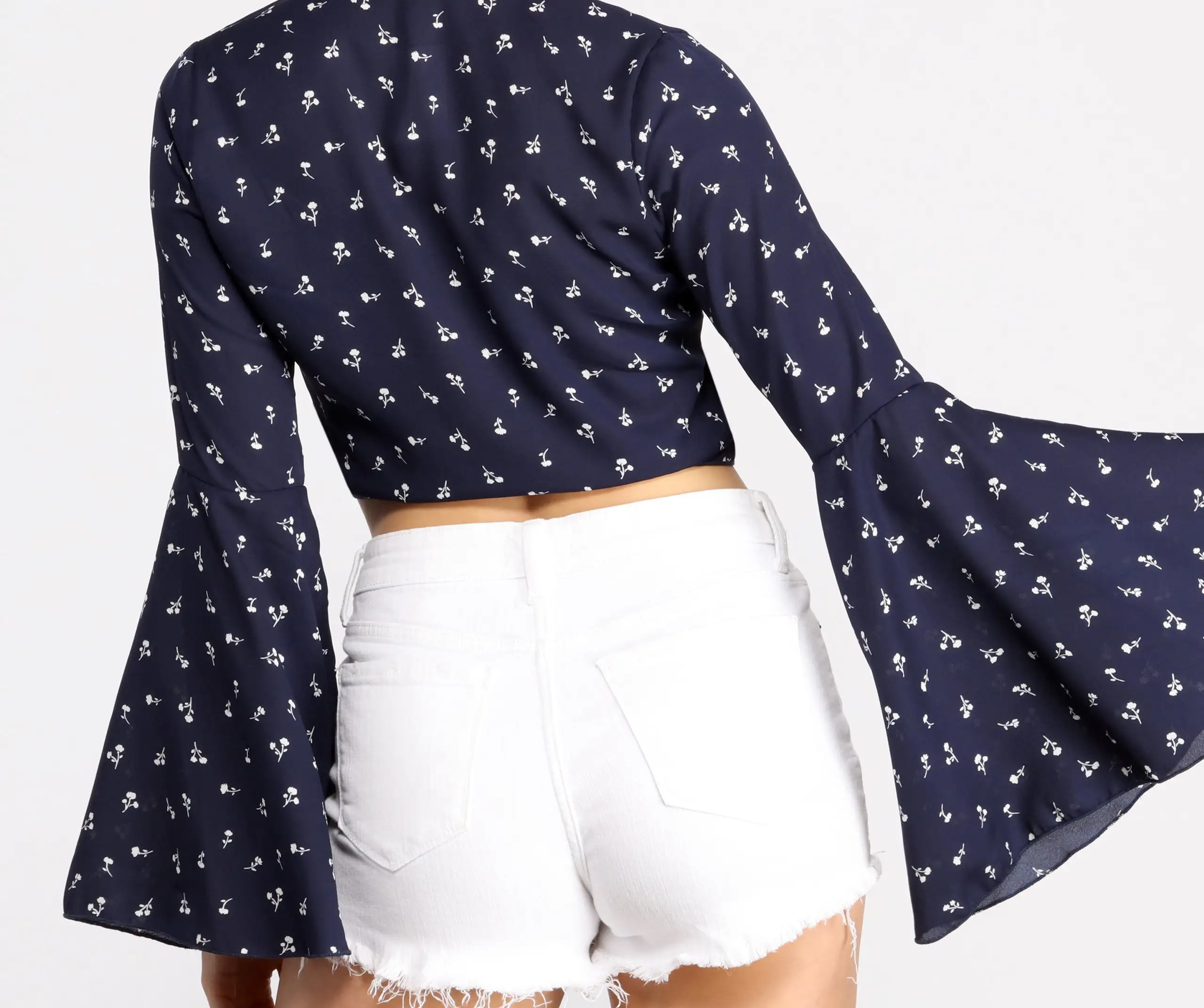 Look just as sweet as can be in this adorable floral bell sleeve top! Pair with some high rise white denim cut off shorts or jeans and strappy heels for the perf fresh spring time vibe.