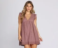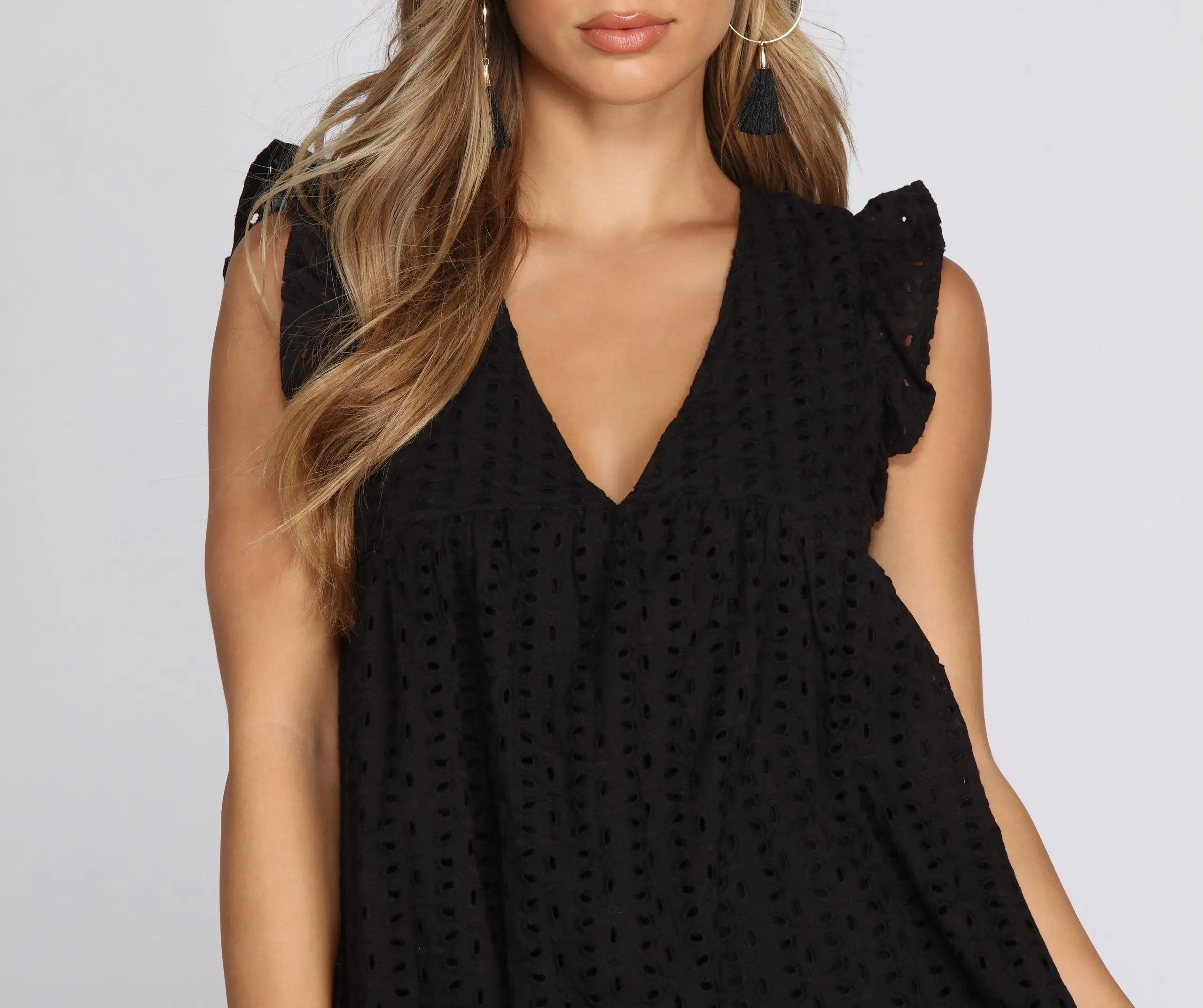 Show us your sweet side with this eyelet-detailed mini dress! It features a V neckline, ruffled cap sleeves, single-button closure with keyhole at back, an empire waist, and a short A-line skirt with pockets leading to a wavy hemline. Dress is lined, made from cotton, includes a linen short underlay.