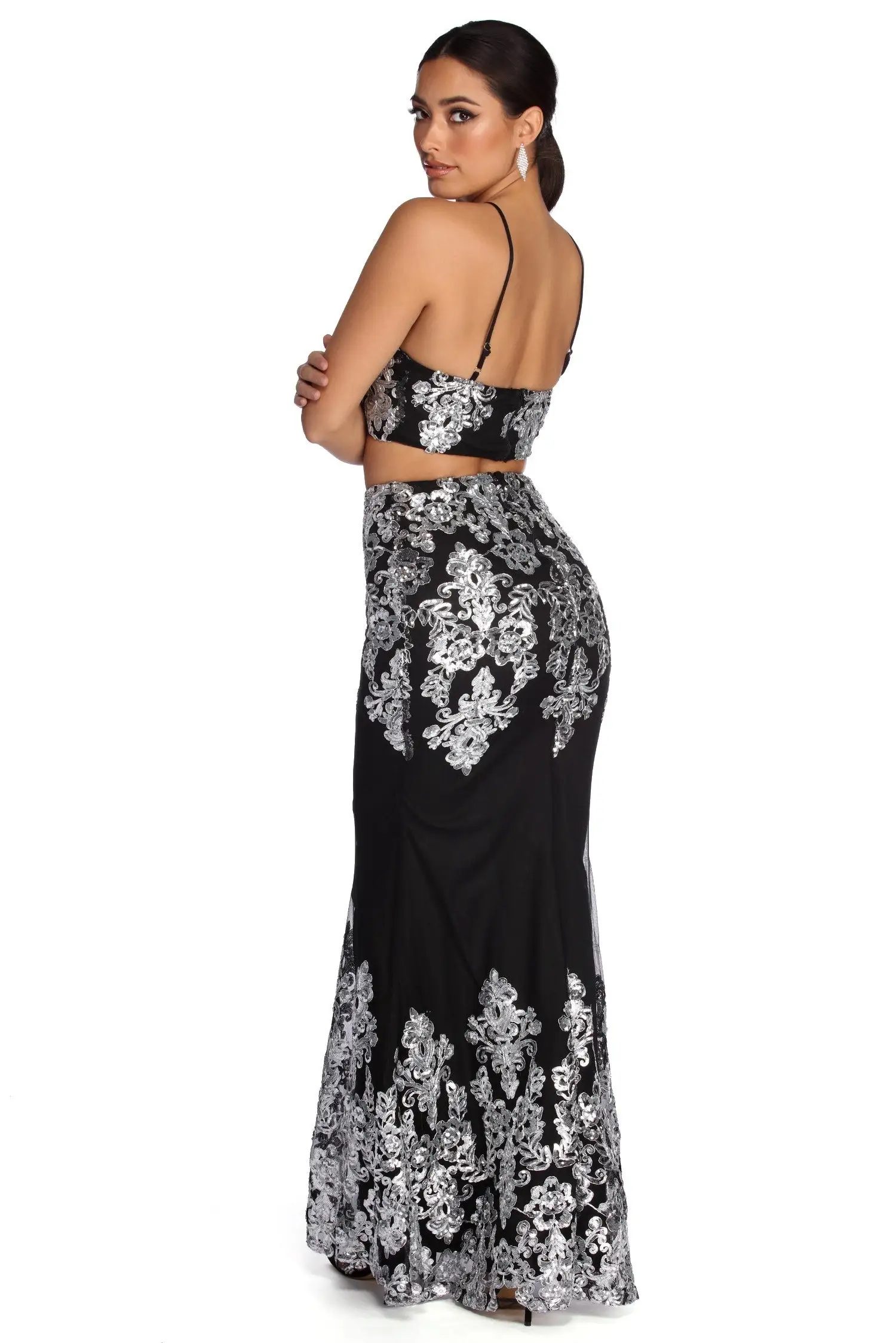 Mesmerize in metallics as you radiate in our Tamara black dress! She features a sleeveless crop top with a square neckline, racer bust, adjustable narrow straps and a back zipper closure. Her bodice features a black hued mesh fabric adorned with silver hued metallic sequin accents set in a baroque pattern. Her matching skirt features a high rise waist and an elongating floor length. Skirt is composed of a lined tulle fabric that includes a back zipper closure. Dress offers a relaxed fit with minimal stretch.