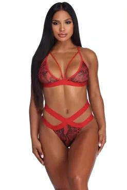 Because you can’t be tamed tonight! This sexy snake print set features a sheer mesh bralette with red adjustable straps and a hook and eye back closure. The cheeky panty also features sheer mesh with double red waist bands.