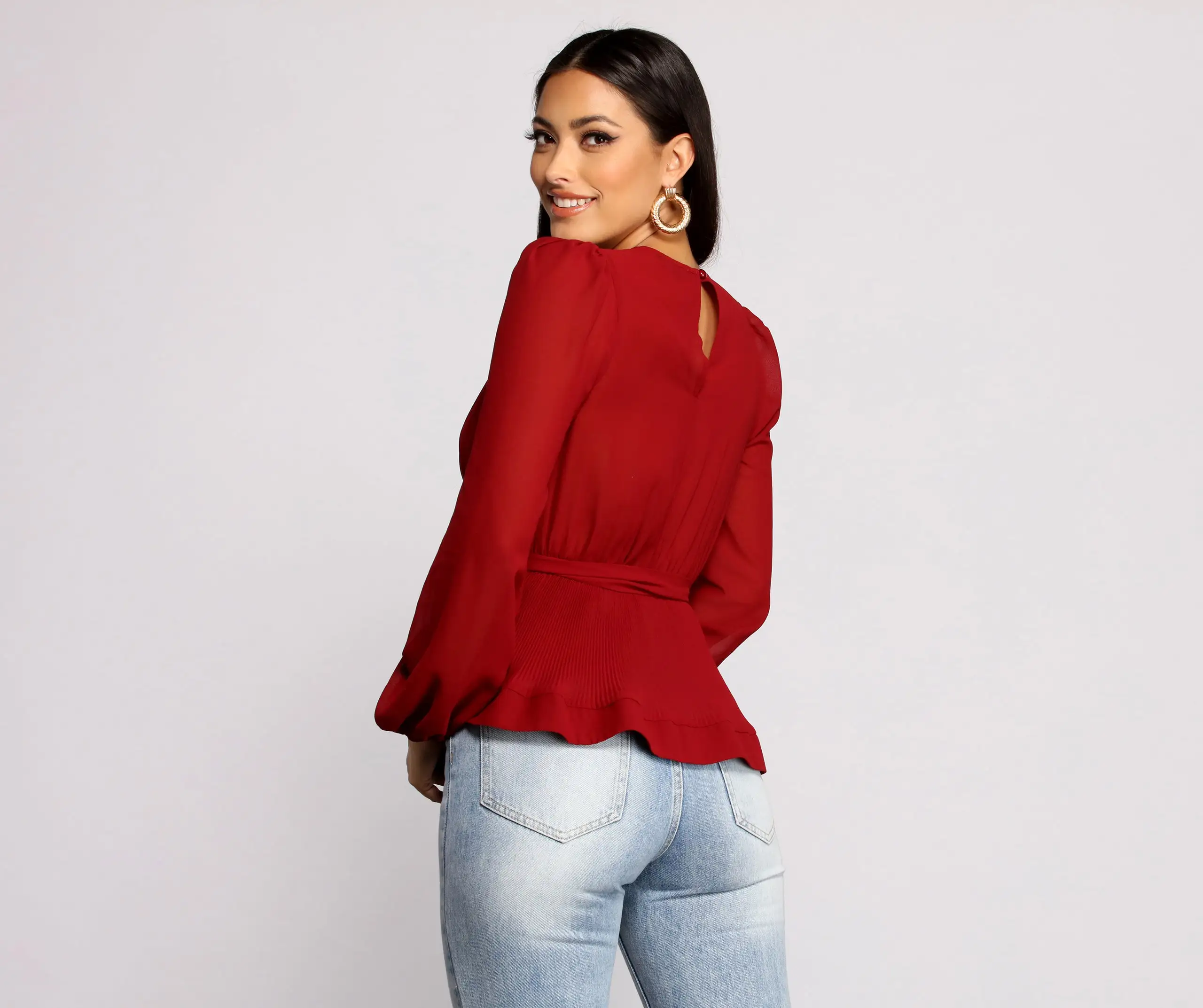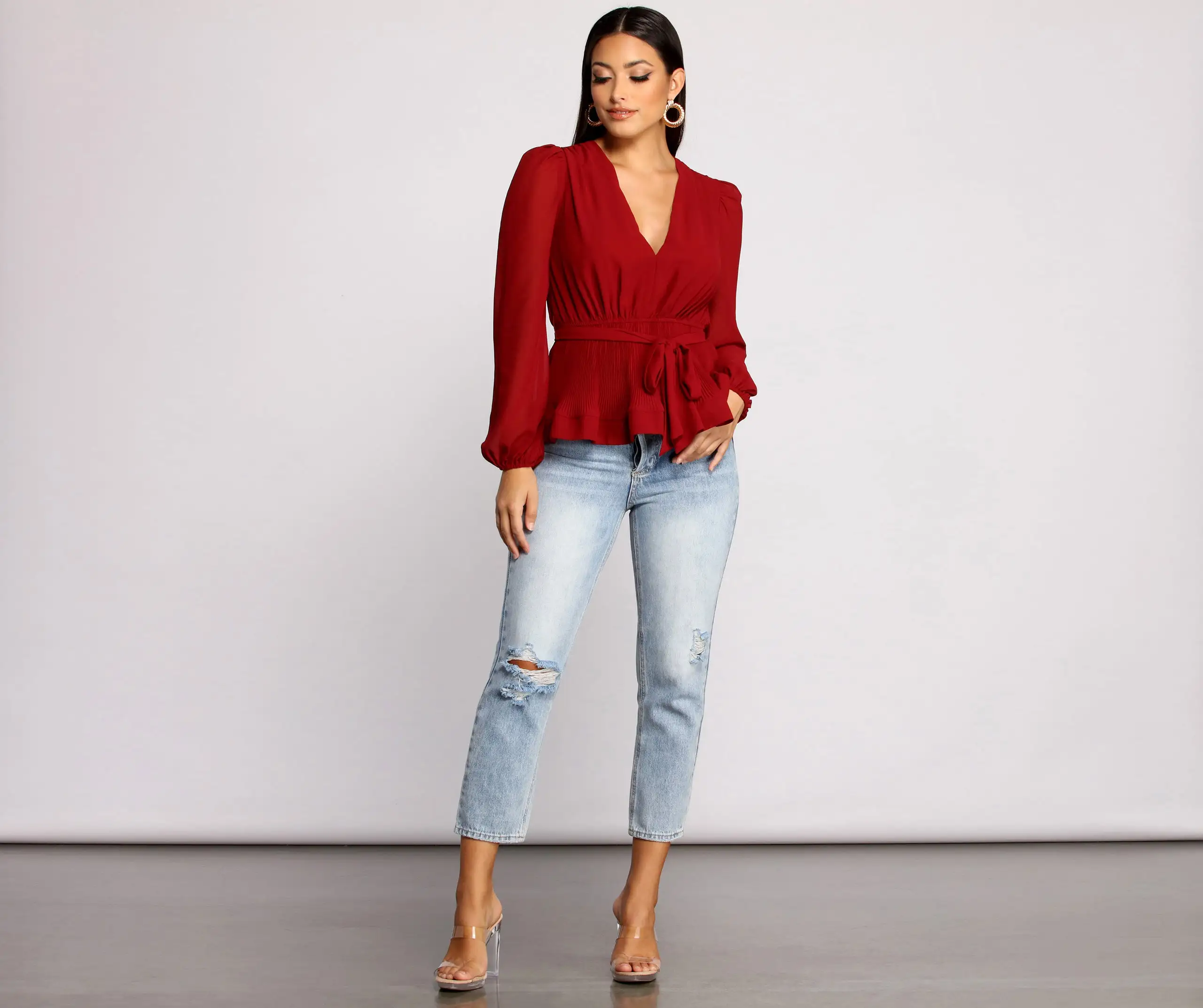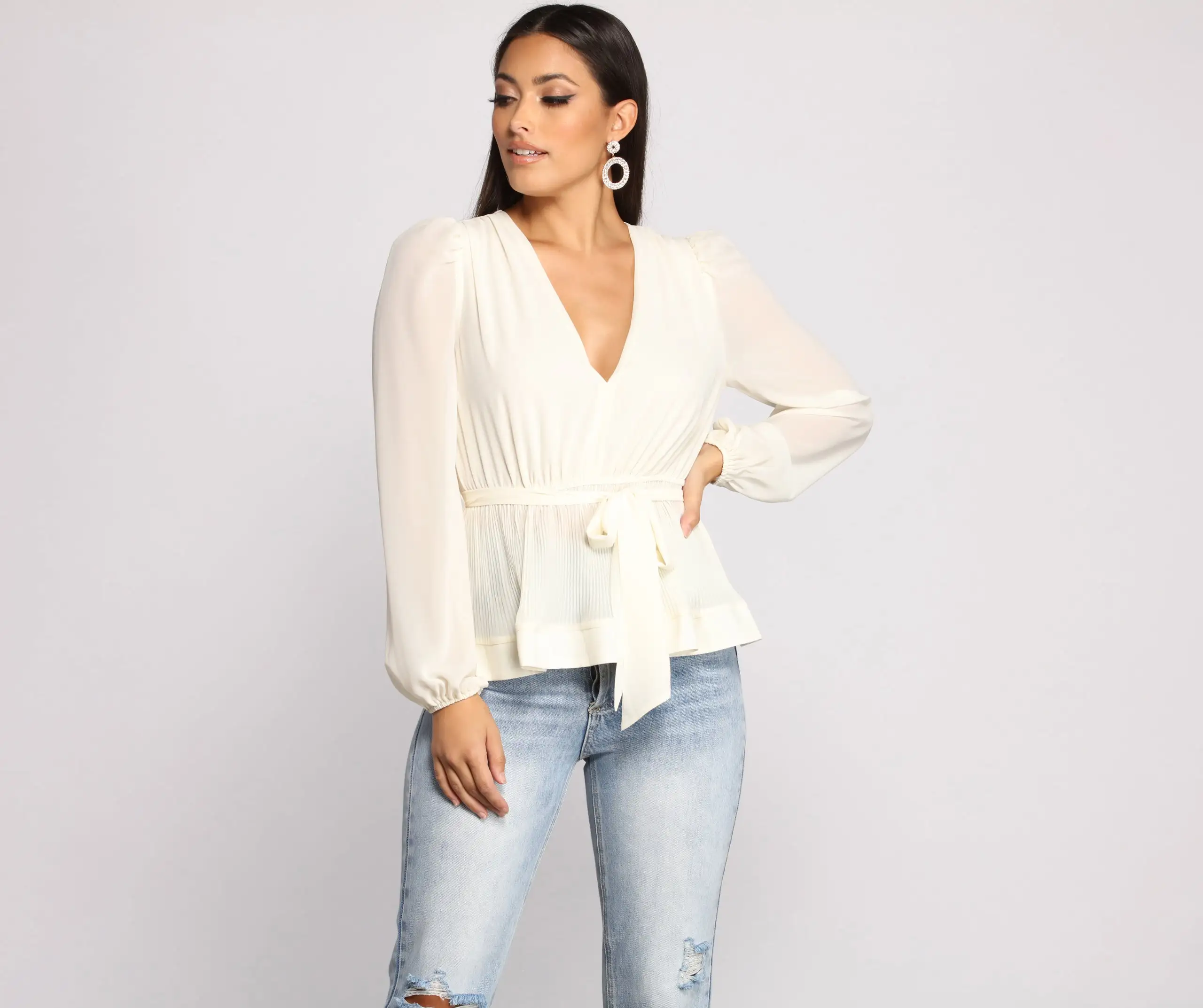 This gorgeous chiffon peplum top is perf for wanting to elevate your everyday style! It features a flattering V neckline and a chic tie front detail. Wear this top with a pair of