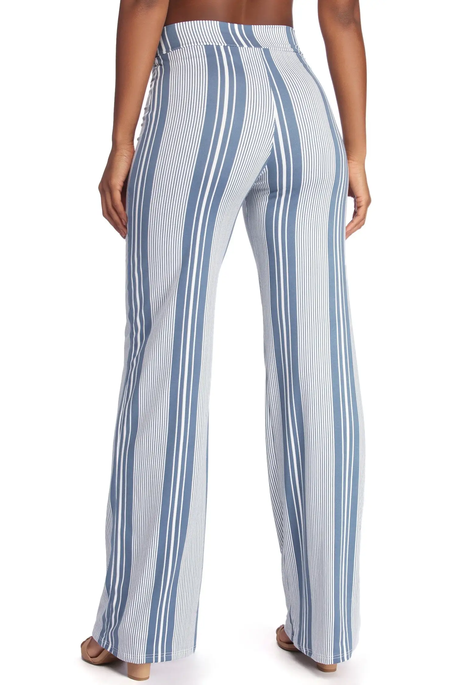 Tie yourself in these cute pants! They feature a high rise waist, a cinching tie waist accent and a slim fit leg with a flared leg opening. The all over striped pattern features narrow white hue that complements the blue background perfectly! Pants are composed of a brushed knit fabric that offers a form hugging fit with a moderate stretch.