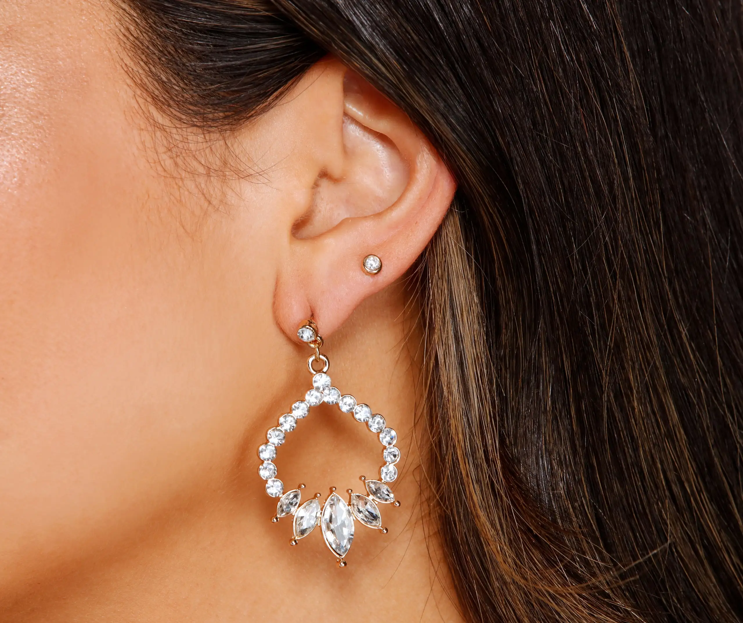 Stun with timeless elegance with earrings that reflect your affinity for the luxe life. The earrings feature a tear-drop-shaped outline of rhinestones with gemstones at the center. Complete look with a