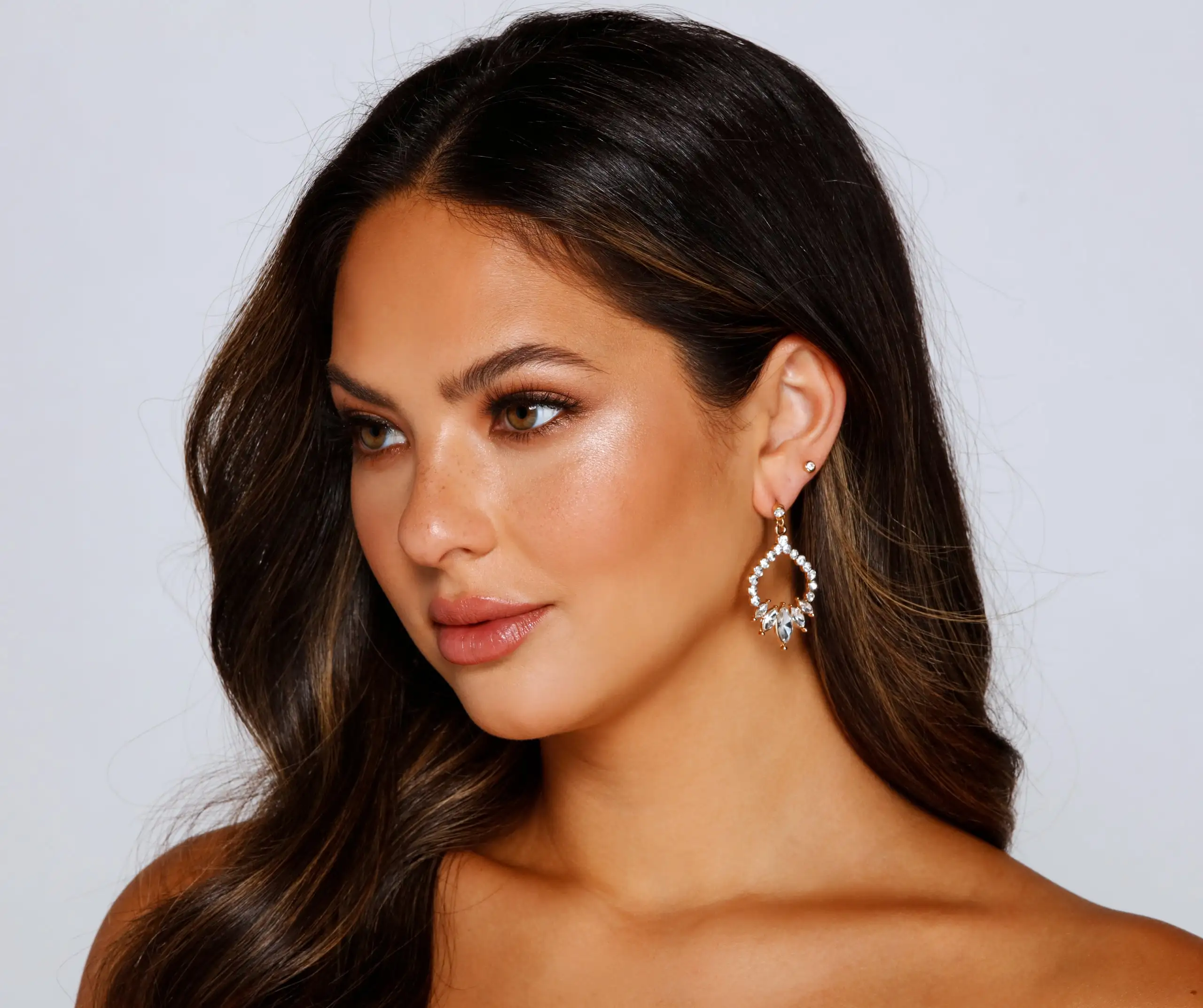 Stun with timeless elegance with earrings that reflect your affinity for the luxe life. The earrings feature a tear-drop-shaped outline of rhinestones with gemstones at the center. Complete look with a
