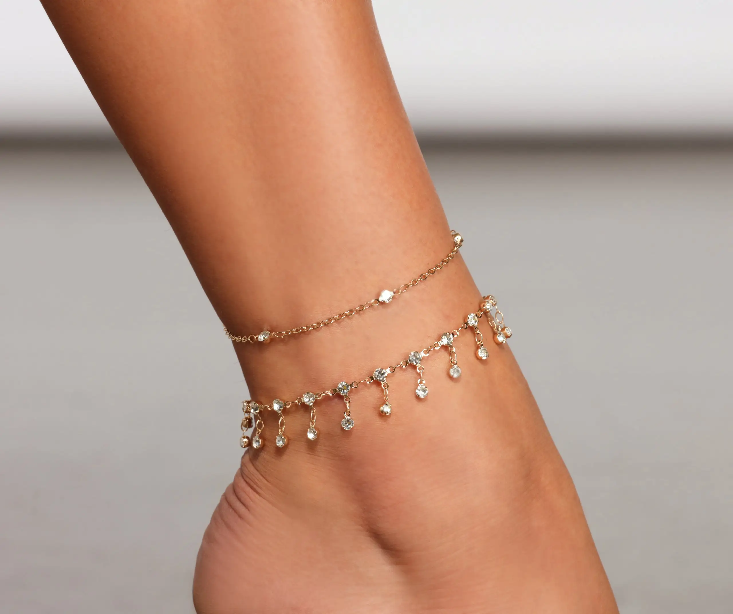 You’ll fall in love with the trendy details of this glam anklet set! It features two anklets that can be layered together for a chic vibe. One anklet features a dainty chain with rhinestone accents and the other features a chain link design with rhinestones and a pretty rhinestone drop design. Style this set with your fave pair of