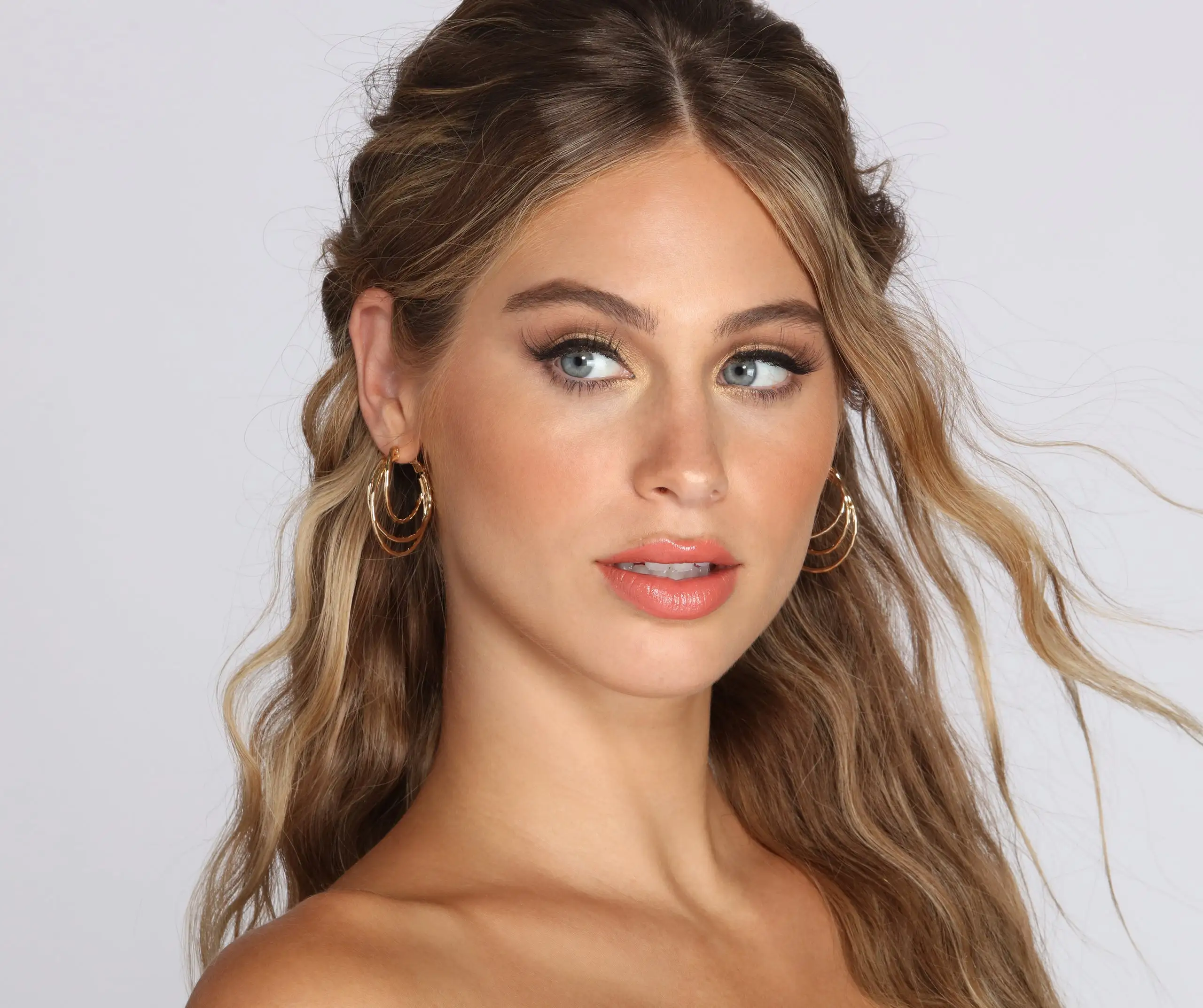 The look of multiple hoops under one! This pair features a design of three multi sized hoops with one omega closure.