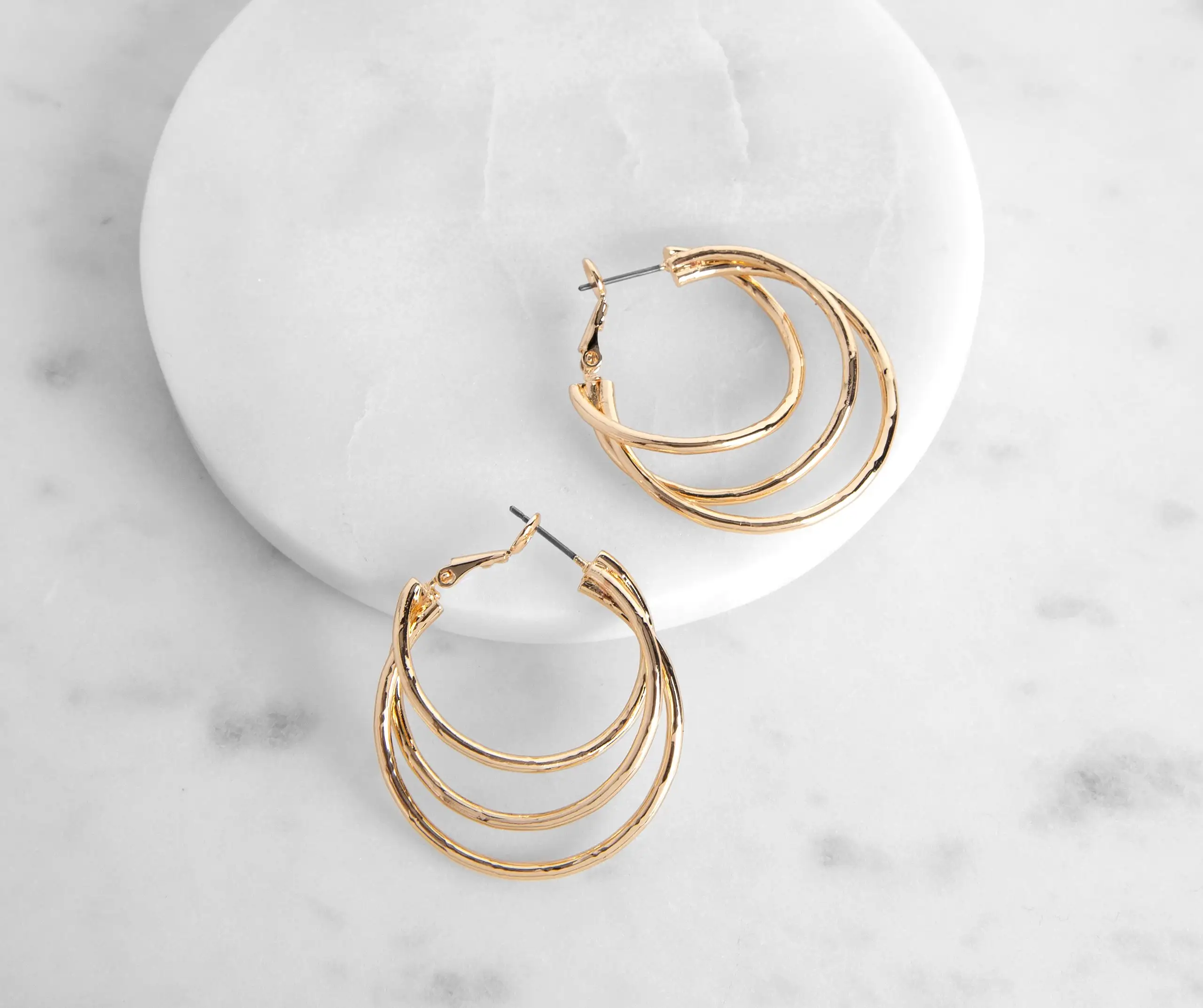 The look of multiple hoops under one! This pair features a design of three multi sized hoops with one omega closure.
