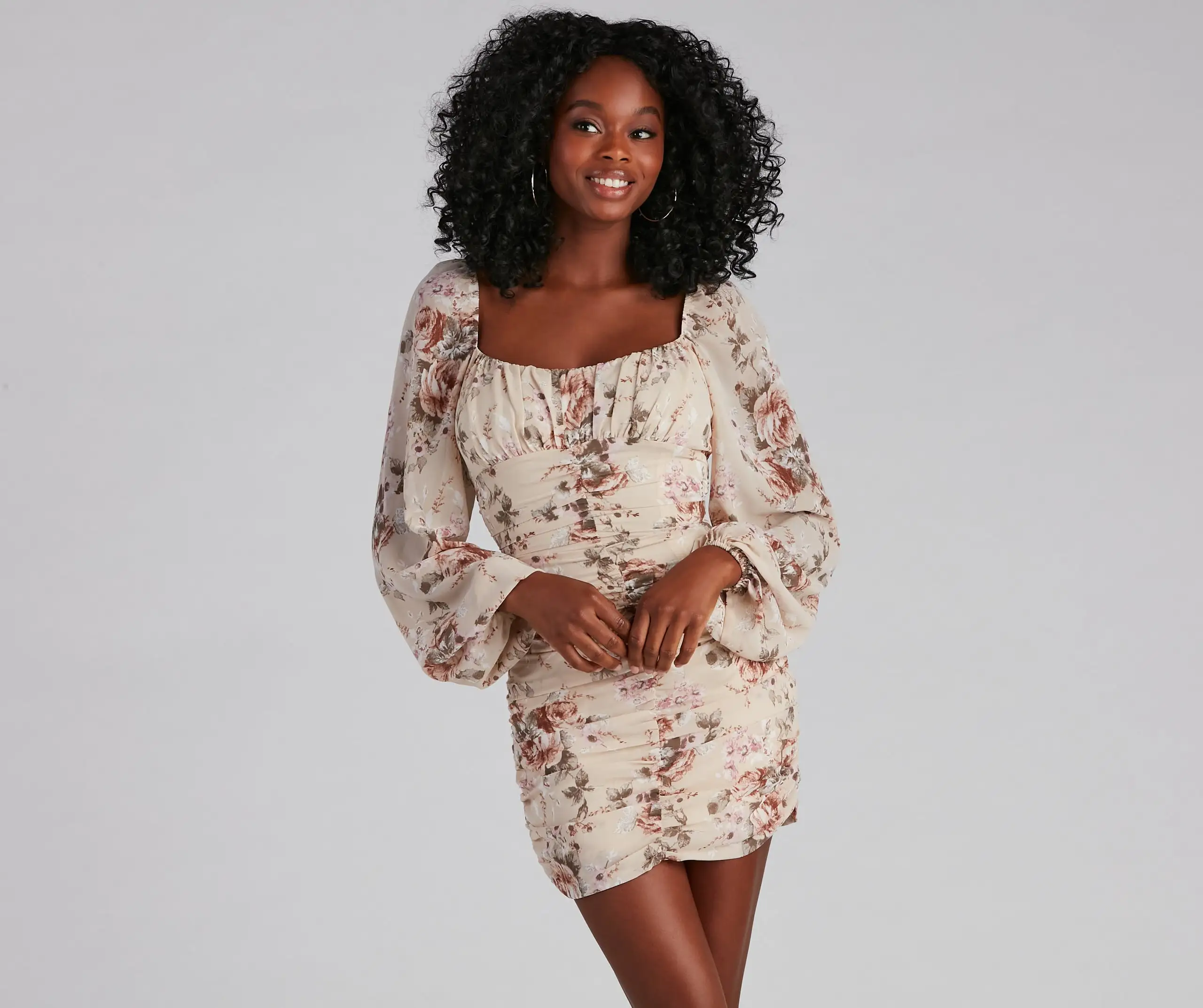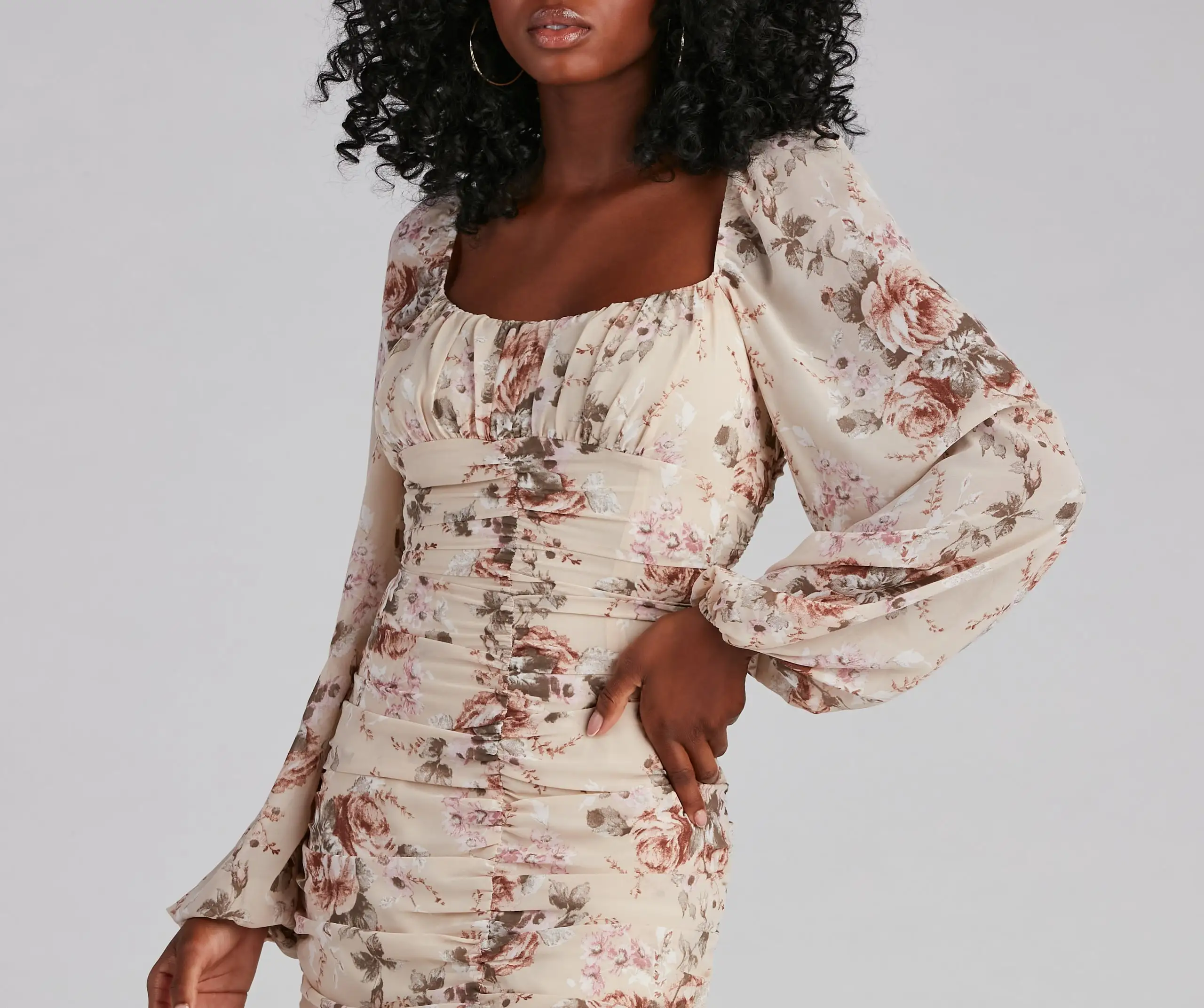 It’s vintage-inspired, darling! Have your moment in this rose print mini dress featuring a square neck, long peasant sleeves, and curve-accentuating ruching, and a bodycon silhouette. Composed of a crepe-lined fabric with no stretch. Style with lace-up