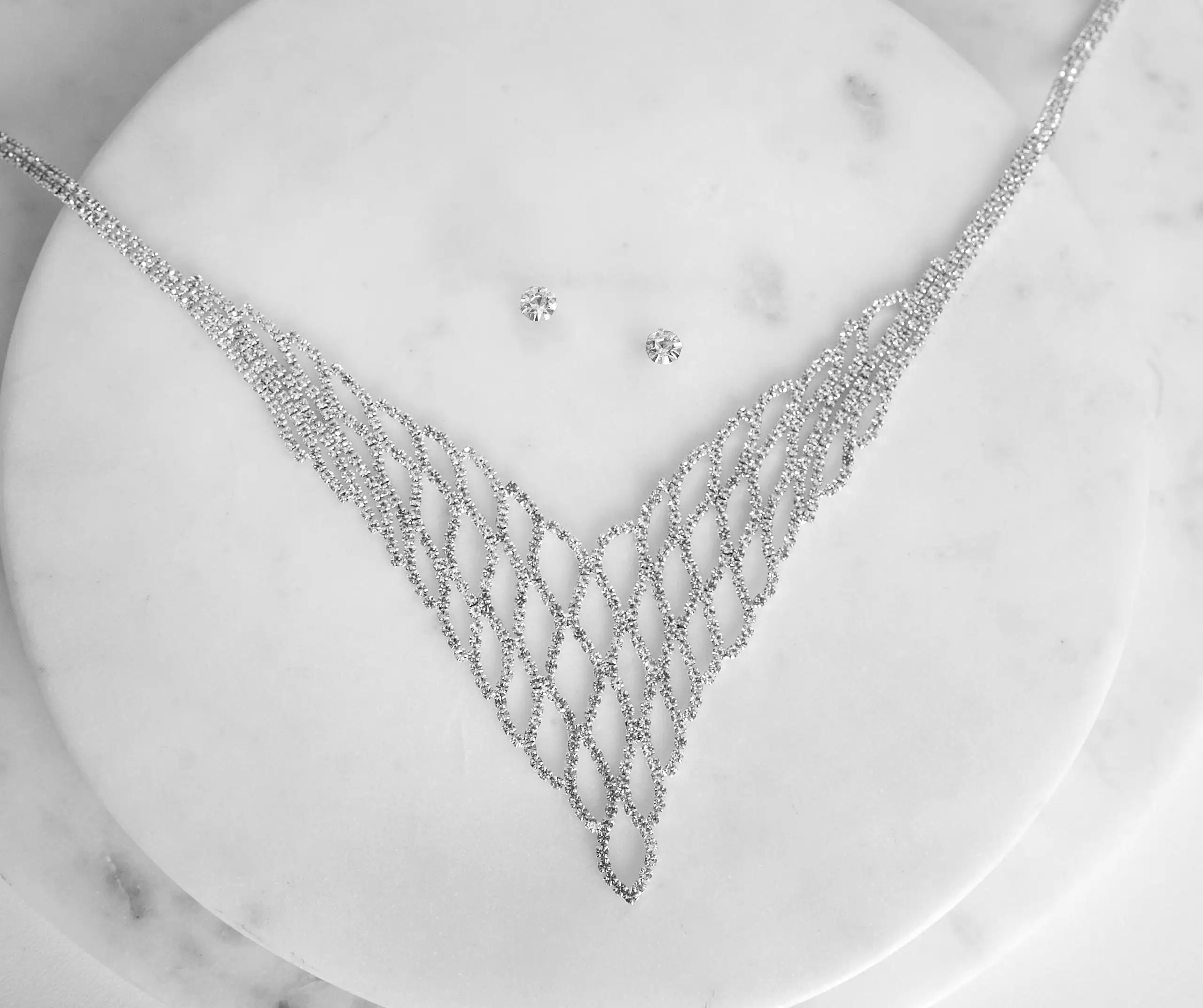 Make your jewelry unique! This set includes a beautiful rhinestone necklace that has a wing shape outlined with rhinestones, and has a lobster clasp closure. Earrings are a simple addition with a stud design and post back closures.