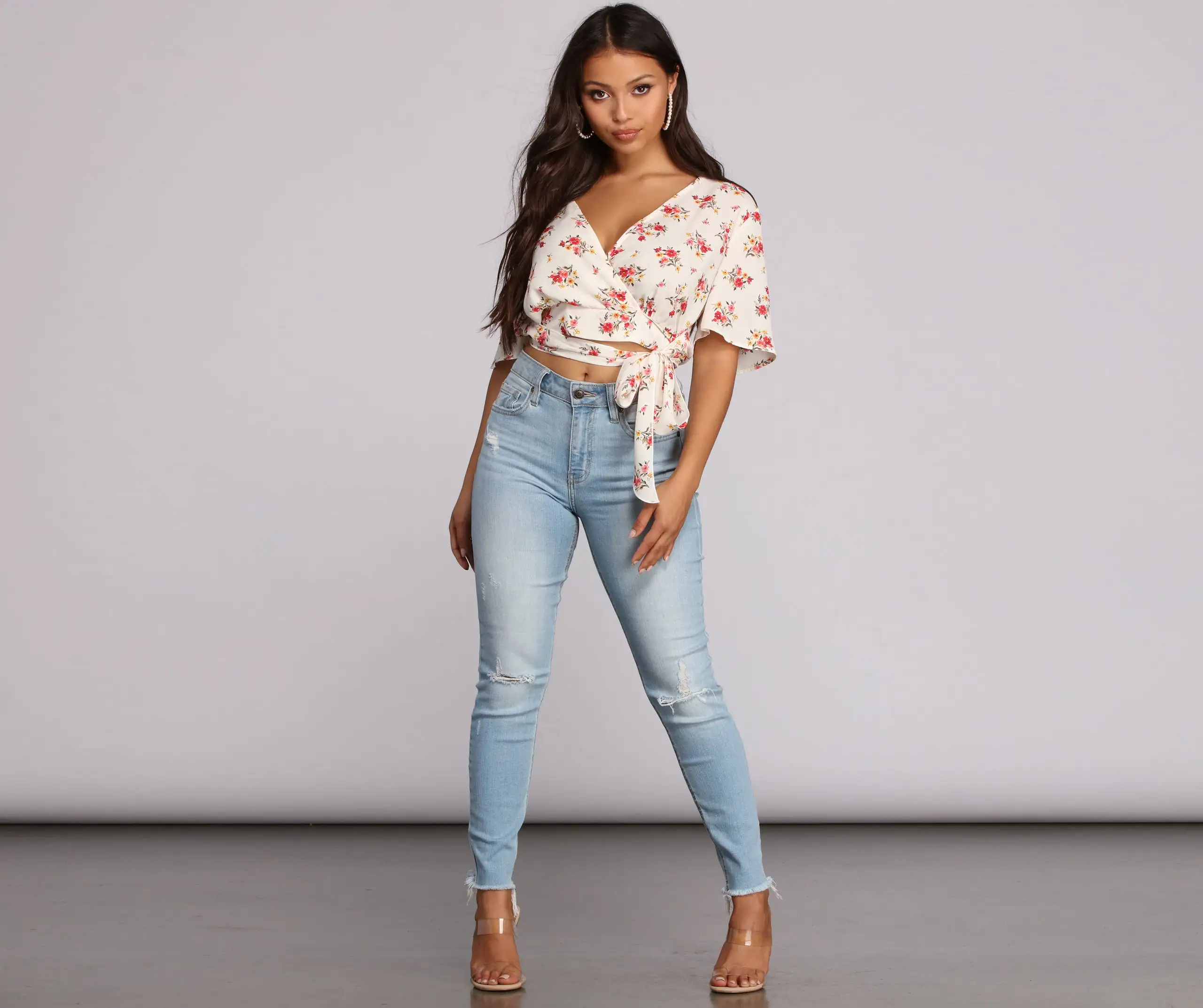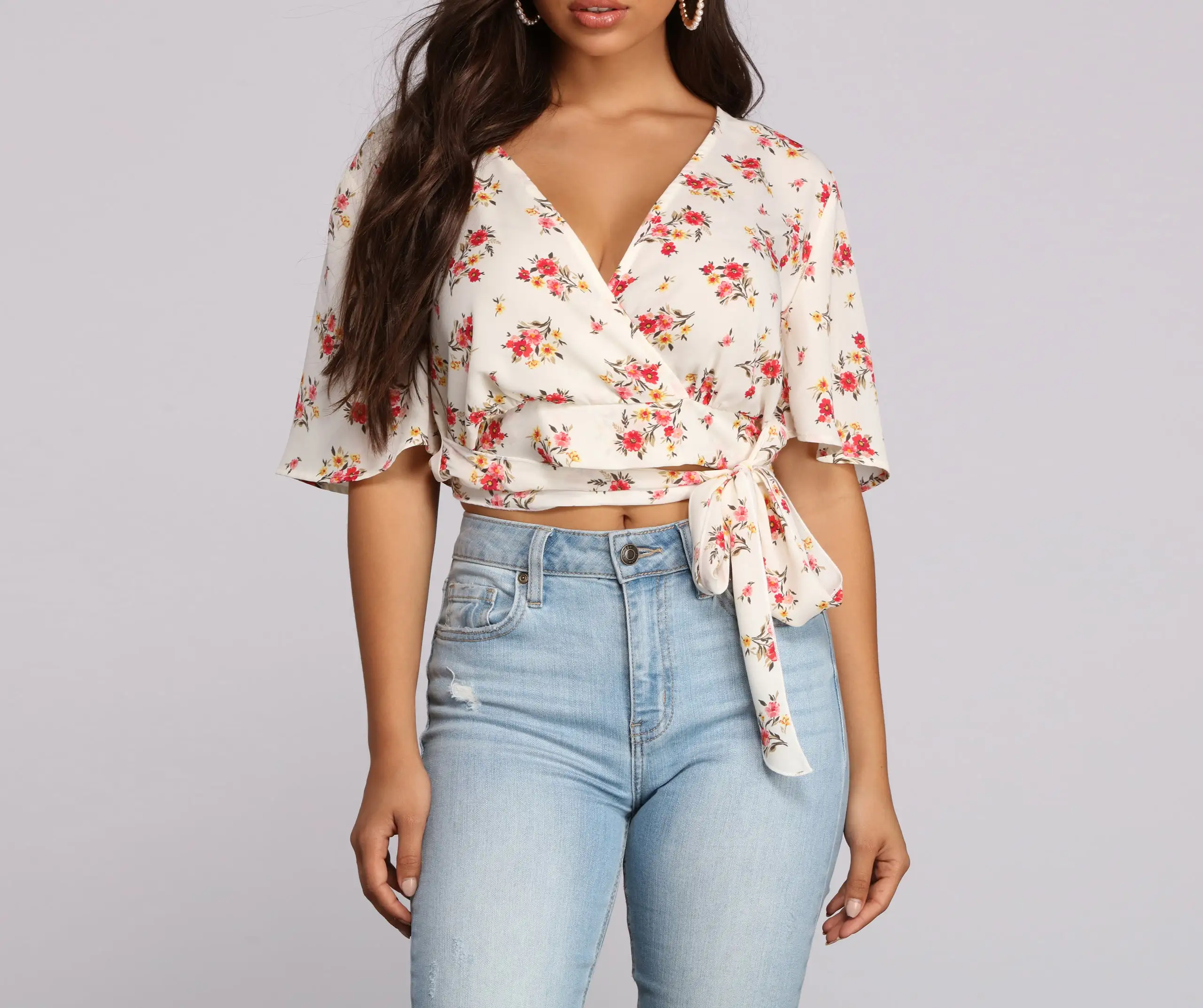 Wrap yourself in romantic florals for a charming look! The top features a plunging wrap V neckline, kimono sleeves, a cropped hem with a tie waist accent and an elastic back. The all over floral prints complement the solid background. Top is composed of a semi-sheer lightweight woven fabric that offers a relaxed fit with a minimal stretch.