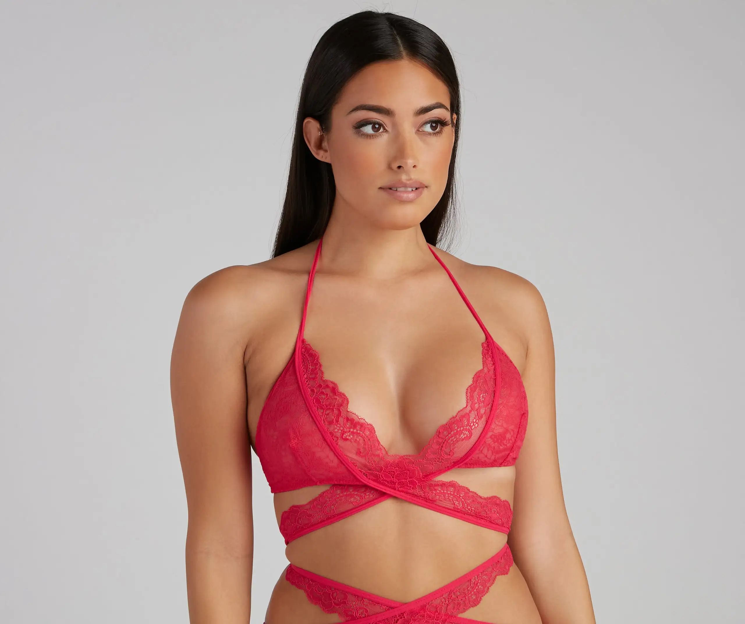 Get wrapped in this sultry sheer lace bra and panty set! The bra features halter spaghetti straps, triangle sheer lace cups, and a gorgeous strappy wrap-front design that ties in the back. The panty features a matching wrap design with a front and back cutout and a cheeky bottom. Style this set with a